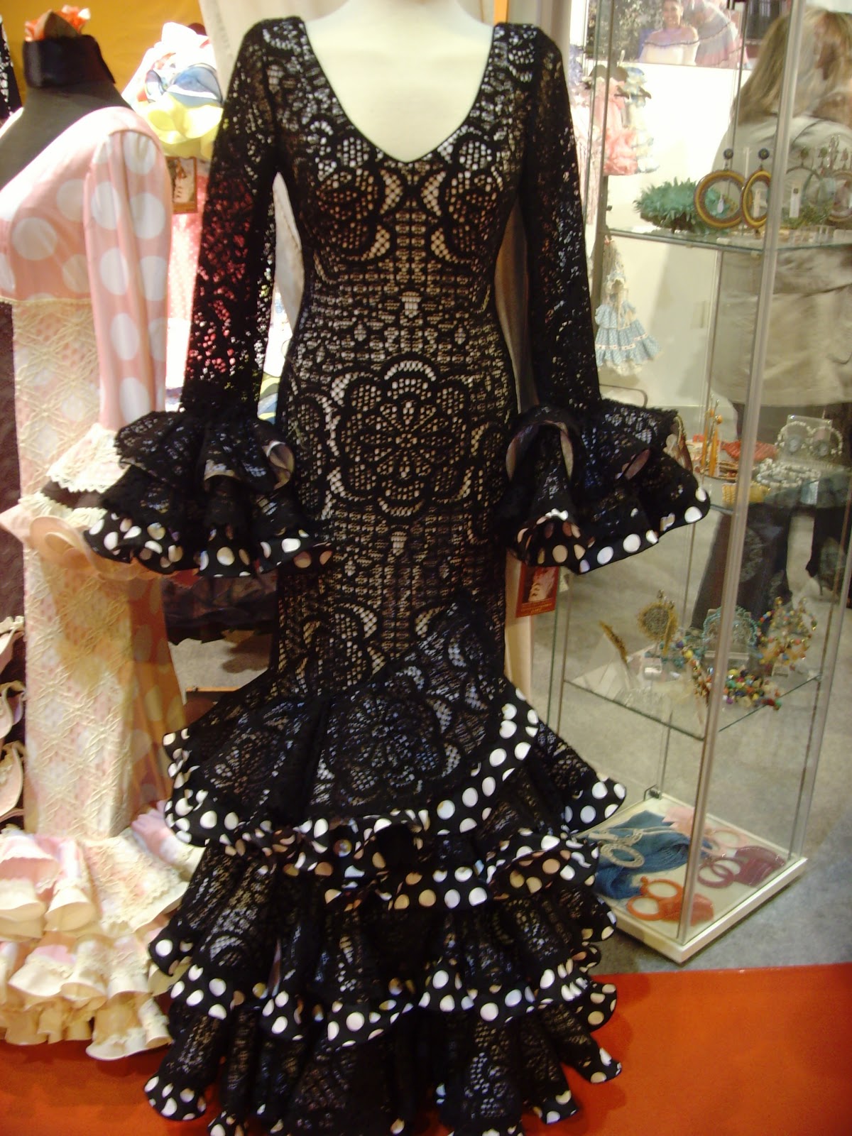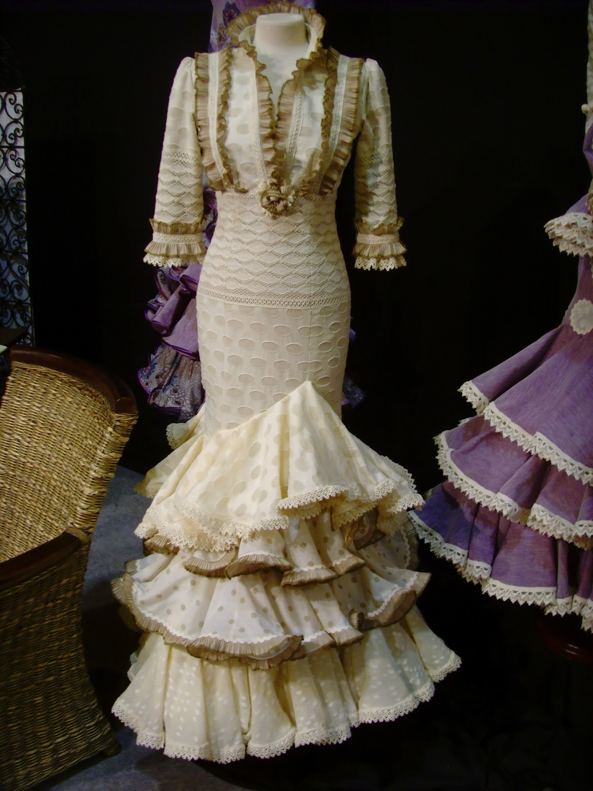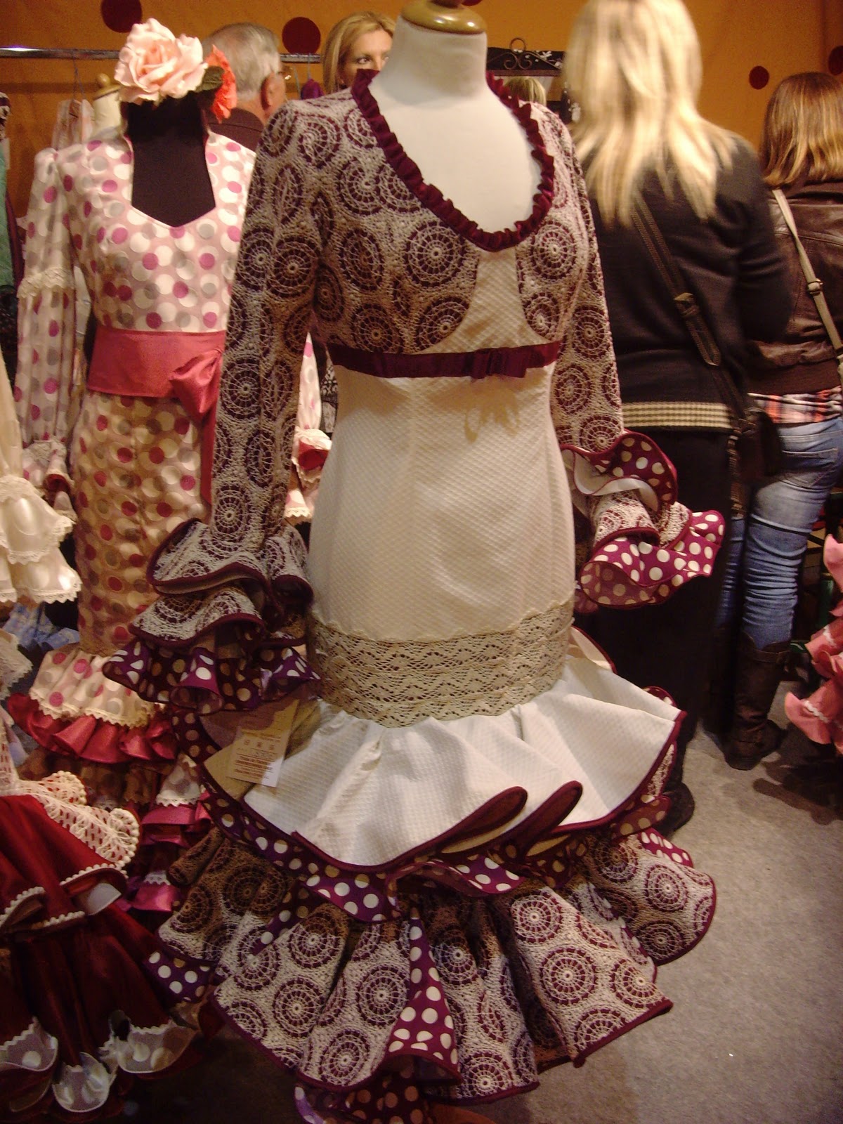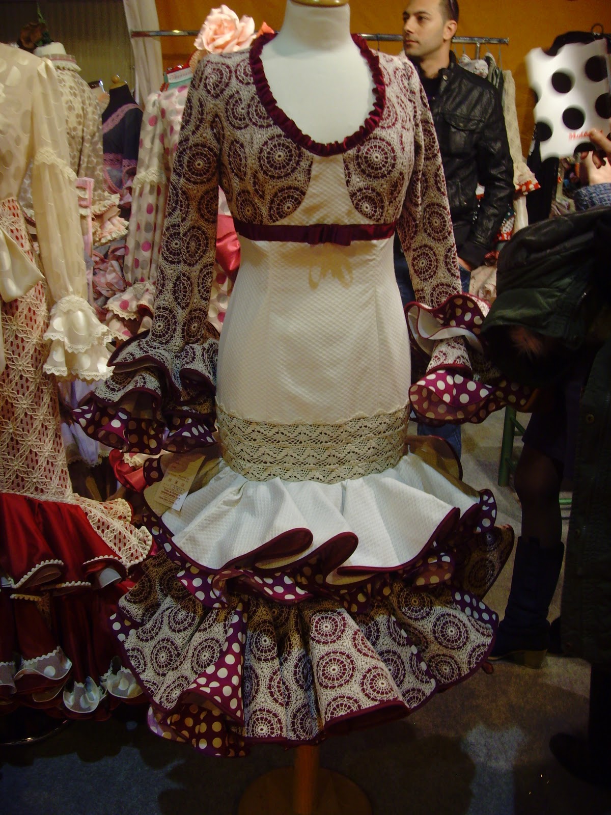 A las 11 en punto, en cuanto abren, vamos para adentro y lo primero que noto es más espacio que otras veces, me da la sensación de que este año hay menos stands que en otras ediciones. De cualquier forma, equipada con mi libreta y mi cámara a cuestas, me dispongo a no perderme ni un trise volante que repose por allí. Me armo de valor y picardía, y escondida entre gentes y columnas consigo hacer las fotos a los trajes que más han llamado mi atención, los que más me han gustado según lo que voy buscando claro, un traje clarito con toques de color, y a poder ser, con algún adorno diferente a lo que he hecho hasta ahora. En mi libreta apunto los detallles de telas, colores, vivos y festones que se pasean delante de mi retina, éstos son mis favoritos: