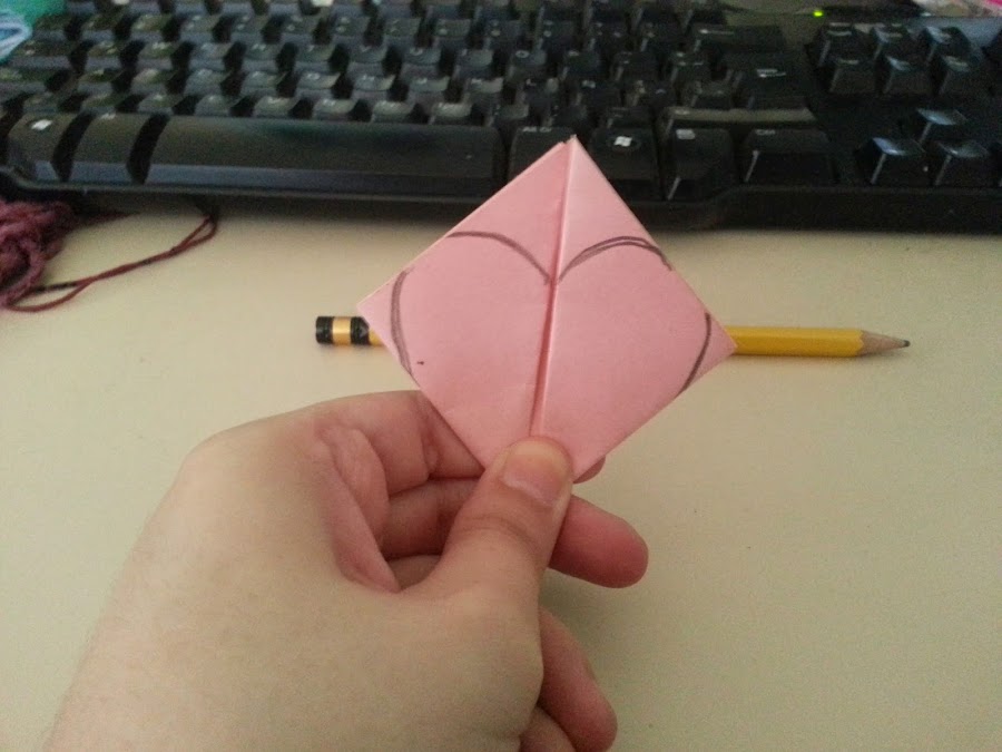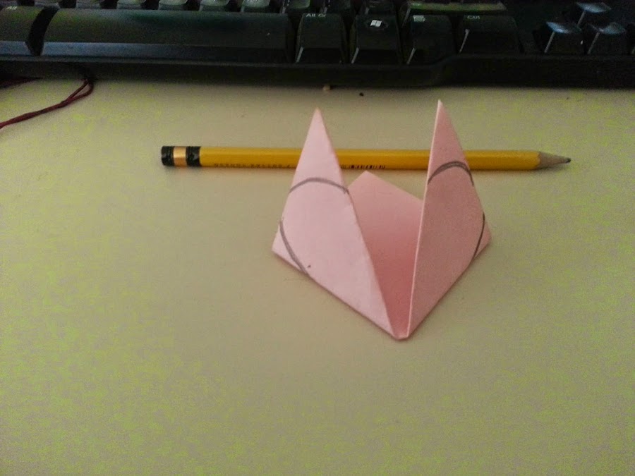 Luego doblan las dos puntas de los laterales hacia la punta central de arriba del tríangulo y con el lápiz le dibujan en cada mini tríangulo un par de semicírculos