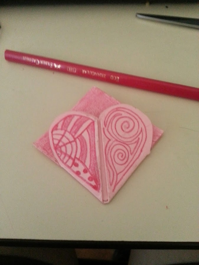 De este modo ponen el sobrante de ficha sobre las dos mitades unidas del corazón y dibujan el contorno