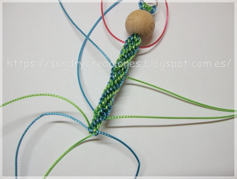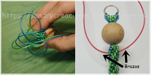 1- Empezamos atando los hilos de scoubidou en una anilla, son 4 hilos de 1 metro atados por la mitad, y los pasamos por dentro de la bola de madera de 2 cm de diámetro:
