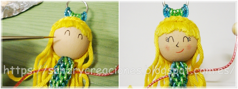 4- Realizamos los cabellos, en este caso variamos bastante el modelo del libro e hicimos un pelo a nuestro gusto, incluyéndole el detalle de una trenza a modo de diadema. El cabello lo hicimos con hilo de algodón amarillo y lo pegamos con cola blanca en la bola de madera de la cabeza:
