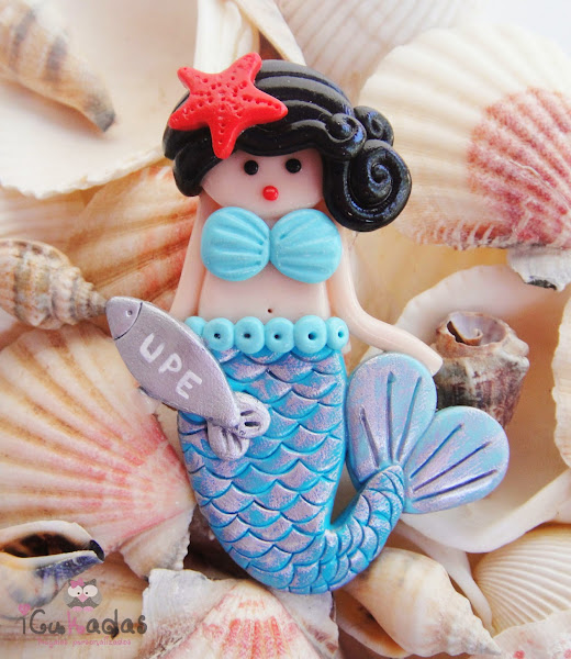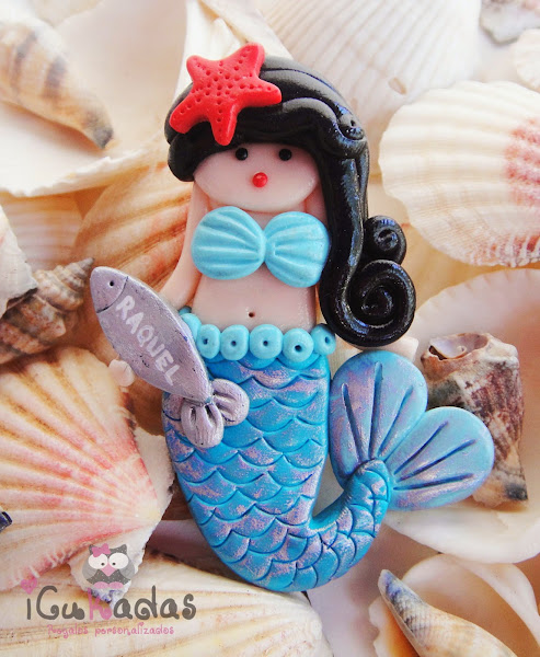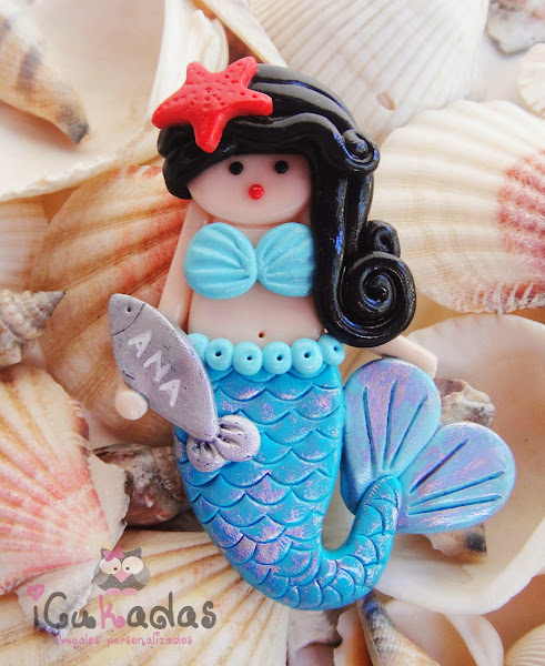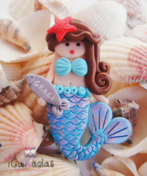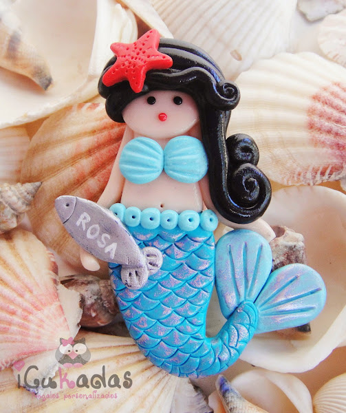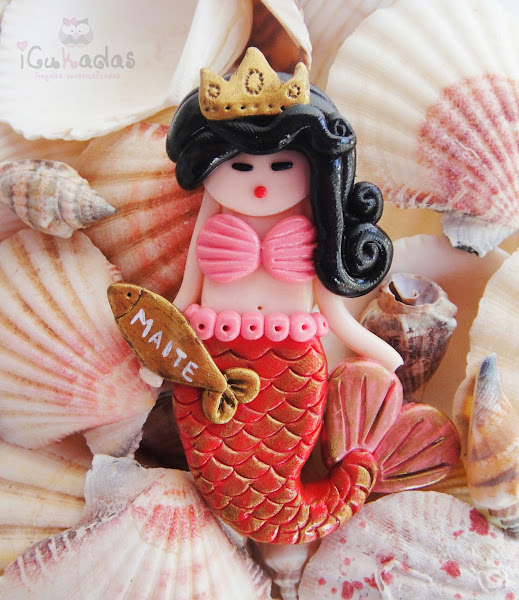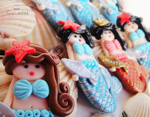Son de arcilla polimérica, aunque la colita lleva un pelín de pintura para que parezcan pececillas, y como es verano, pensé en hacerlas todas en turquesa, y la prota del evento en coral, colores muy marítimos que para eso son habitantes del mar no?