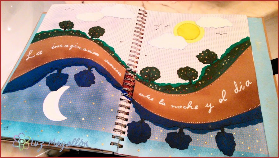 Opté por entintar con distress más intensa la parte inferior (noche) y más suave la superior (día), dibujé y recorte sobre cartulinas lisas y texturizadas un dibujo y pinté pequeños detalles como las estrellas o las flores con liquid pearls de distintos tonos, falso cosido y la frase escrita en blanco que incluye el tema completaron el trabajo.