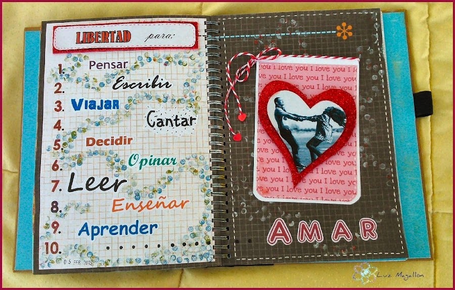 Opté por enumerar algunas de las acciones en las que considero hay que tener libertad y aproveché que era el mes del amor para incluir este verbo en el listado y colocar la postal de San Valentín. Un fondo con marcas de tinta hechas con la goma del lapíz y poco más. Así quedó.