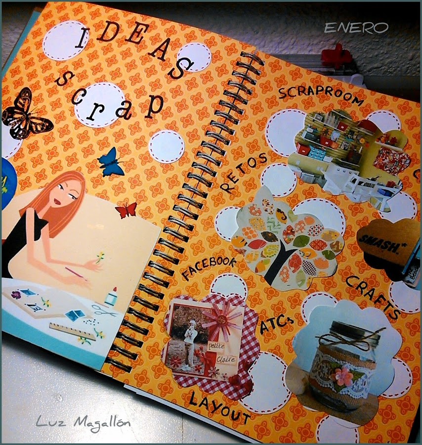 El tema propuesto para el mes de Enero era: "IDEAS SCRAP" así que me decidir por incluir imágenes de todo aquello que tengo en mente realizar durate este año. Como las páginas de mi smash eran de un color demasiado impactante también troquelé circulos blancos para compensar tanto color.