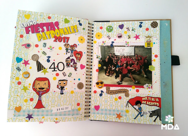 Para realizarlas he usado la portada del programa de las Fiestas Patronales que estaba lleno de bonitos dibujos que hicieron los chicos del "cole", y además un montón de elementos que me recordaran esos días: la música, las risas, el bingo, el color, el calor y las avispas...agggg!!!! además he usado una fotografía divertida. Un batiburrillo de elementos con poco orden, así son las fiestas.