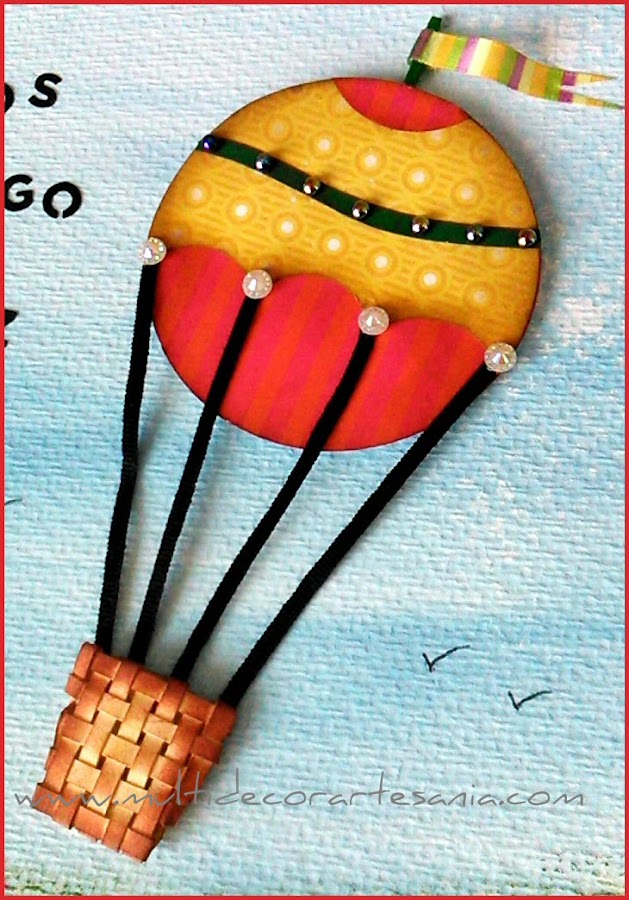 Hice un fondo en varios tonos de azul pintado con acrílicos, un camino amarillo con una terminación brillante, letras negras troqueladas con la troqueladora de Martha Stewart y un globo aerostático realizado con papeles diferentes.