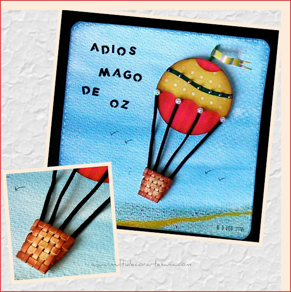 En esta ocasión las cintas, elemento obligatorio este mes, van en la bandera y las tiras que unen el globo con el cesto, por cierto, este está trenzado manualmente con pequeñas tiras de papel y por último, todo el conjunto envejecido con distress.
