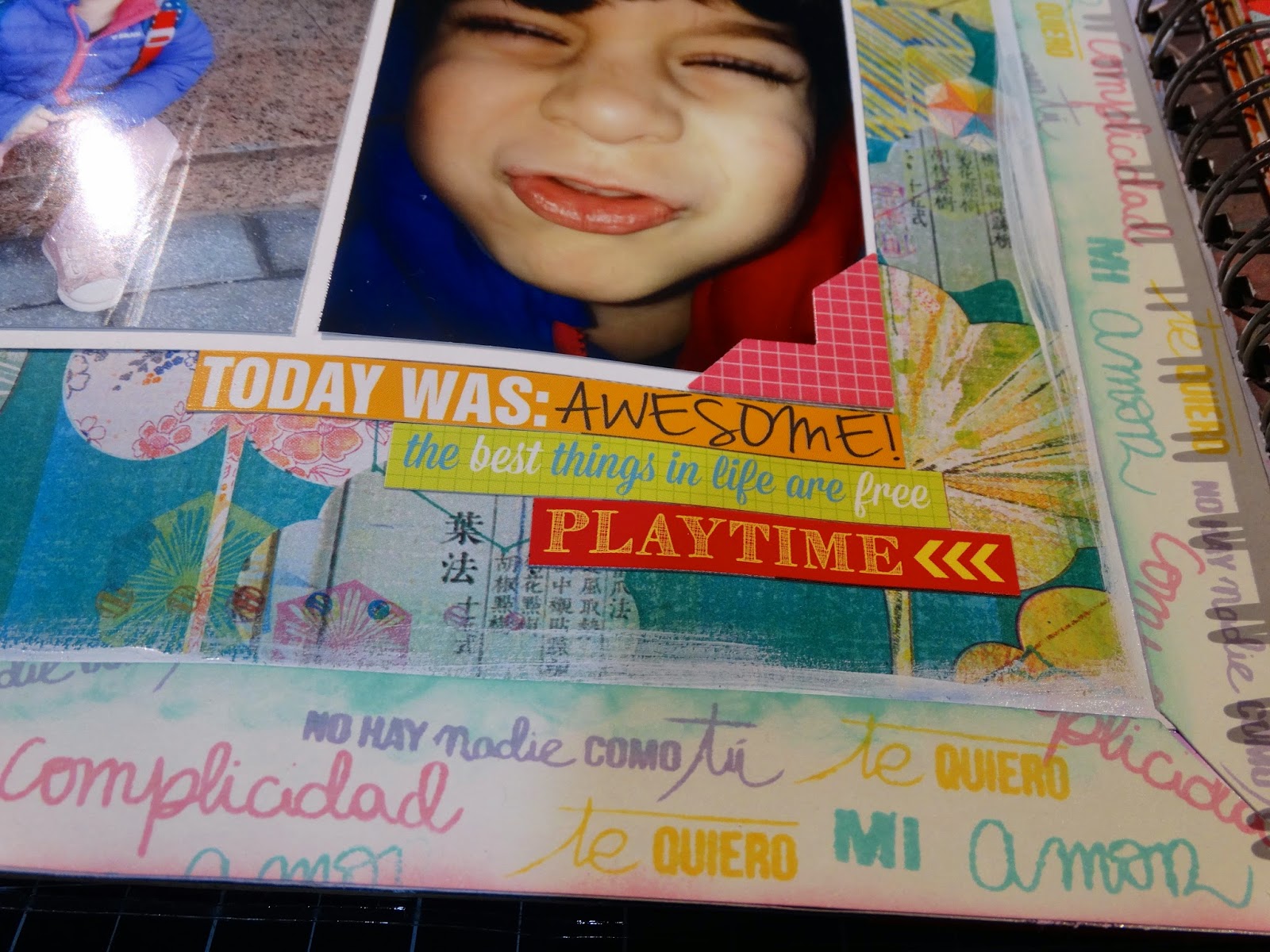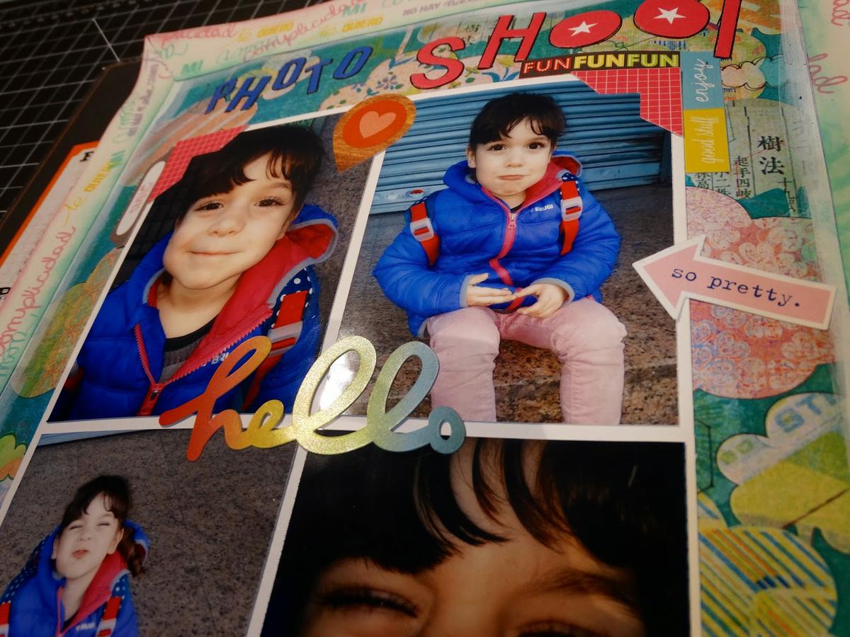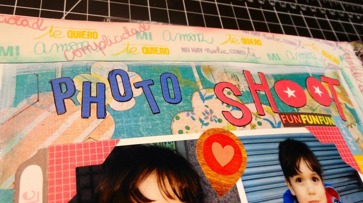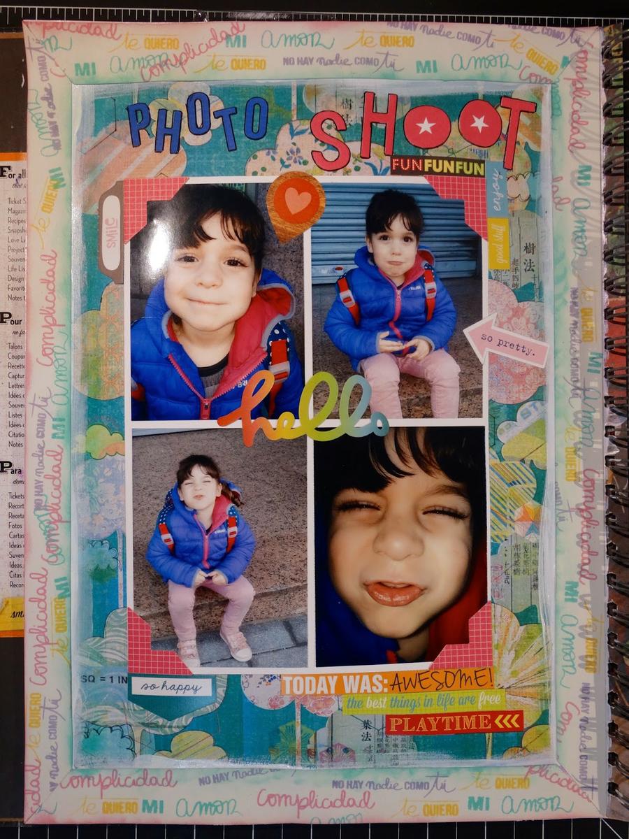 Para arreglar un poco la página, he sellado en distintos colores sellos con mensajes de la colección "muero de amor" de Lora Bailora en cartulina blanca y luego he hecho un marco al rededor de toda la página. Tanto el título como el resto de adornos son todo pegatinas de distintas colecciones. Ya sabéis que no quiero dar mucho volumen al smash de este año...