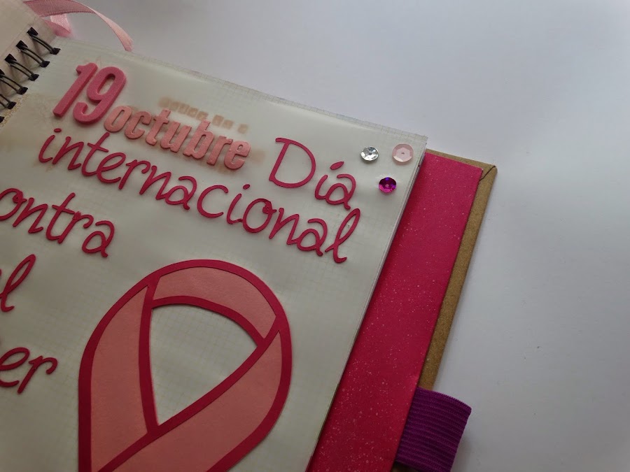 Simplemente puse un papel vegetal encima de la página original del smash y en ella pegué un lazo rosa bien grande y el título, todo cortado en cartulina rosa con la cameo. Como adorno unas pocas lentejuelas y listos.
