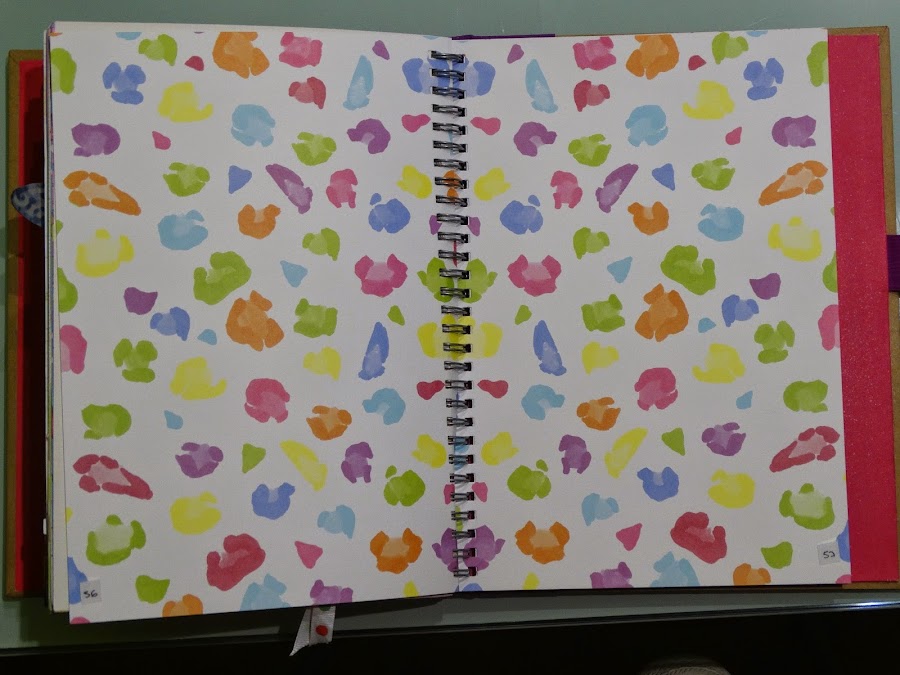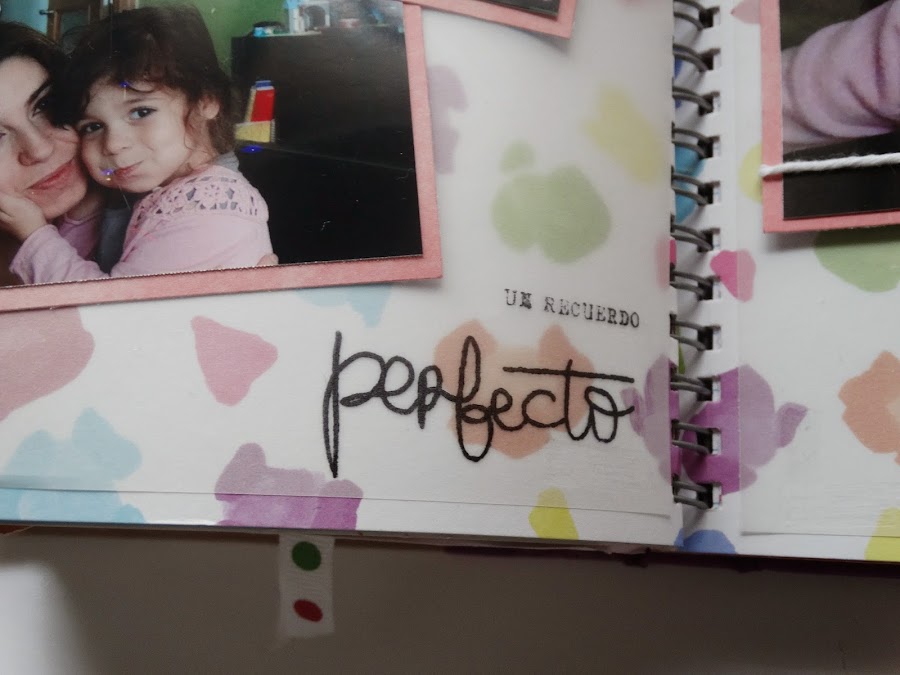 El fondo me gustaba, pero quería hacer una página un poco más "suave", así que, como en otras páginas anteriores, puse un papel vegetal encima del papel original y así conservar los colorines del fondo, pero más tenues. Y bueno, así es como quedó: