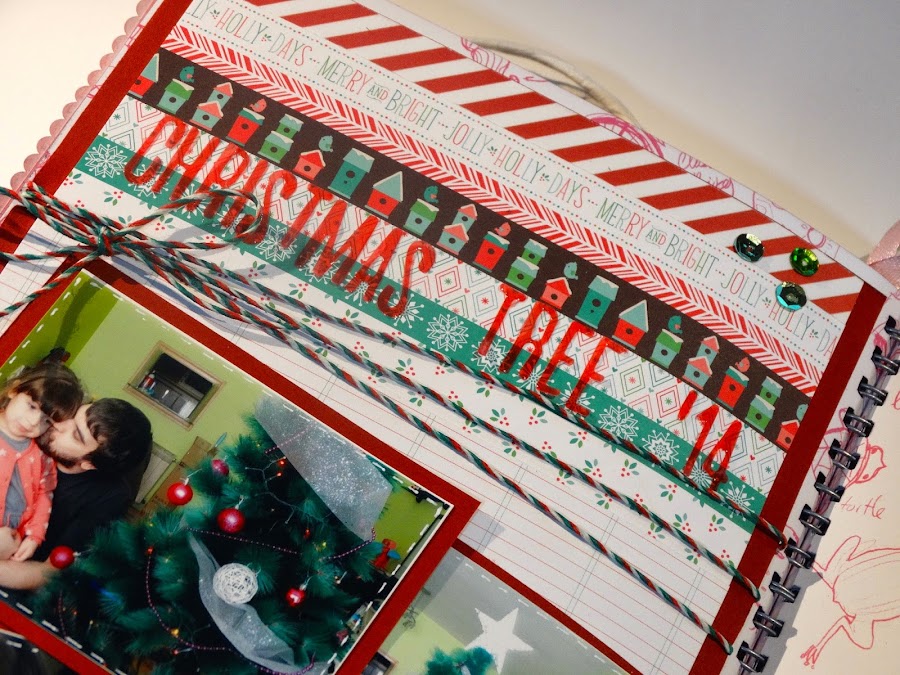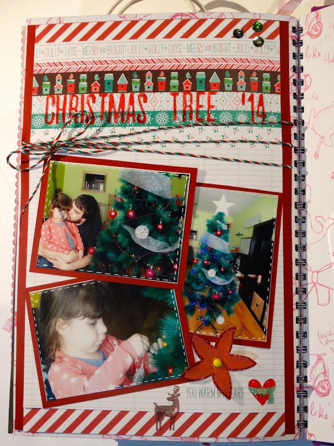 Para esta página he usado cartulina granate, varios papeles decorados, hilo twine, un par de sellos (el ciervo y la flor), lentejuelas, pegatinas (para el título) y glossy para resaltar el título y el corazoncito con la bufanda, que me parece una monada. Un boli de gel blanco para el falso cosido de las fotos y un brad y stickles para resaltar la florecita roja.