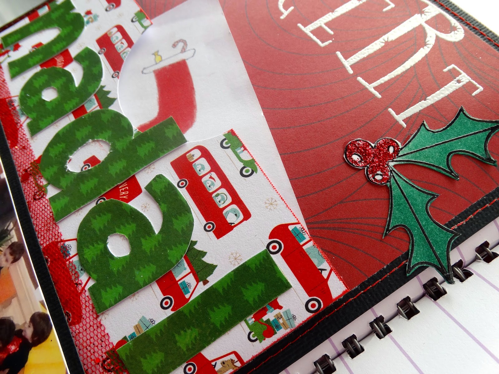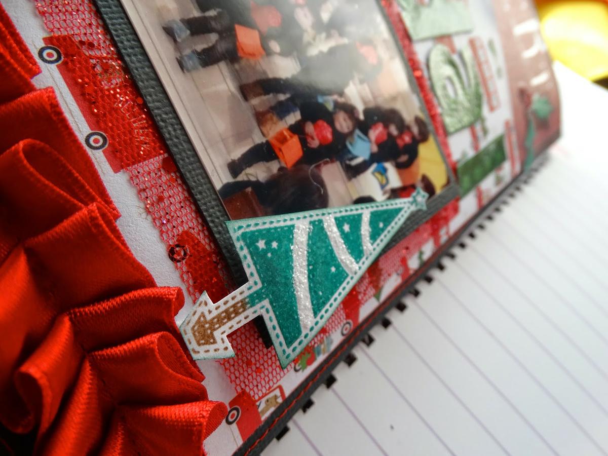 Como decoración, a parte de las costuras y el fruncido, he usado unos sellos de navidad que tenía del año pasado que los embossé también y luego recorté y pegué a mi página.