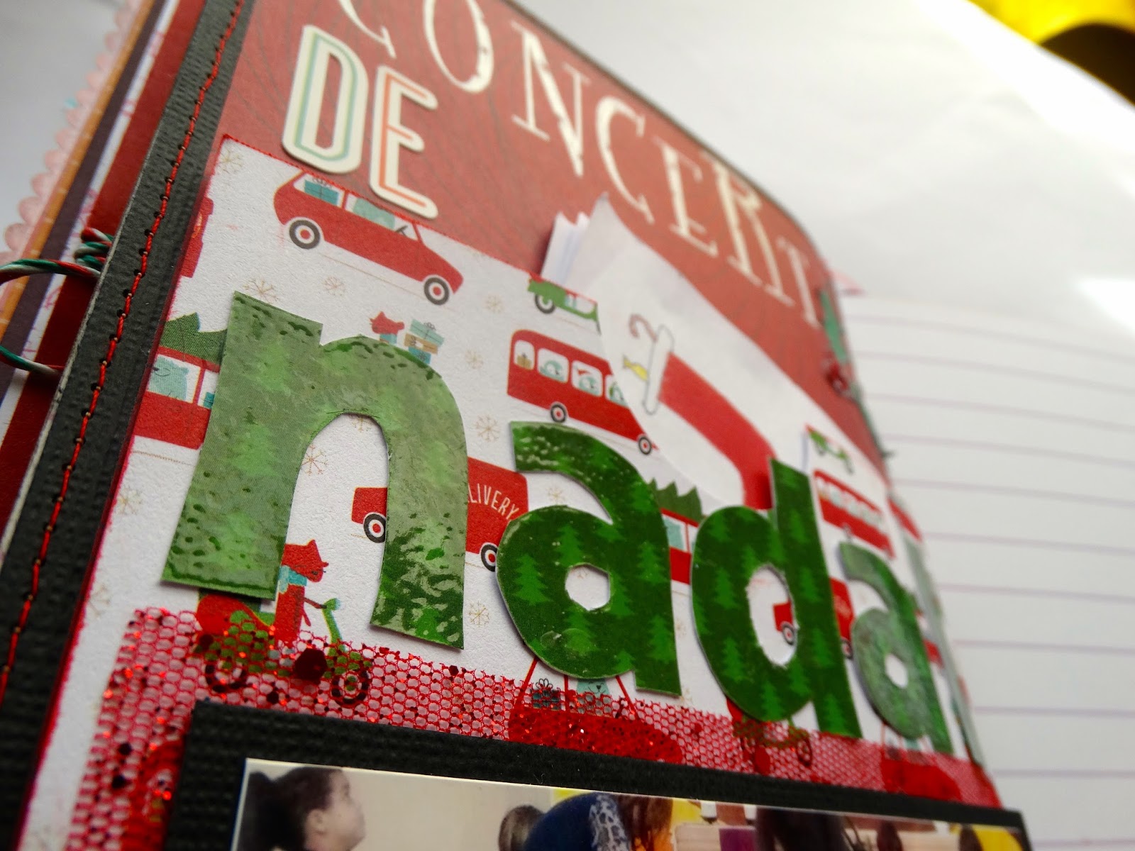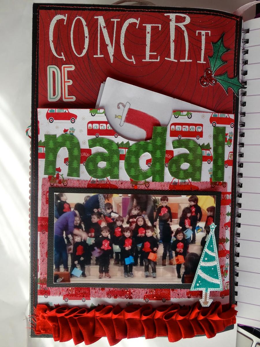 Para el título he usado unos sellos y emboss en caliente blanco para la palabra "Concert". Unas pegatinas para el "de" y emboss transparente para la palabra "nadal", que luego recorté y pegué en el bolsillo.