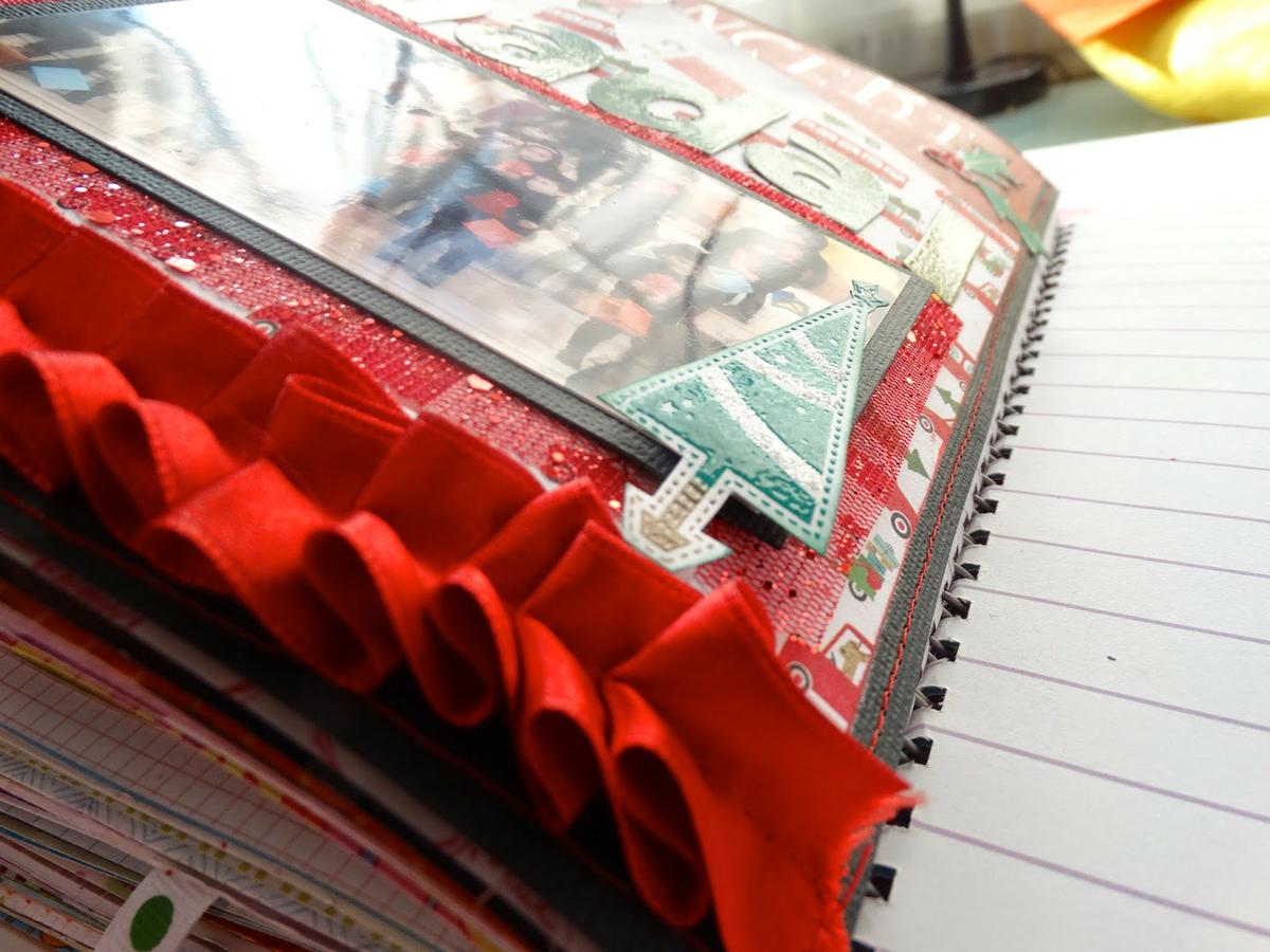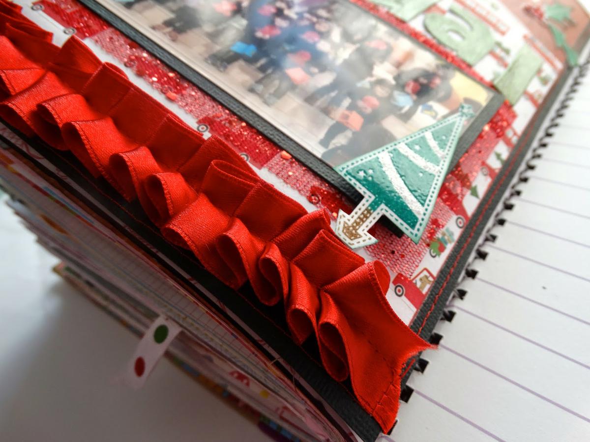 Luego he hecho un fruncido con cinta de raso roja abajo del todo de la página y lo pasé por la máquina de coser. También aproveché a hacerle un borde alrededor de toda la página con la máquina con hilo rojo.