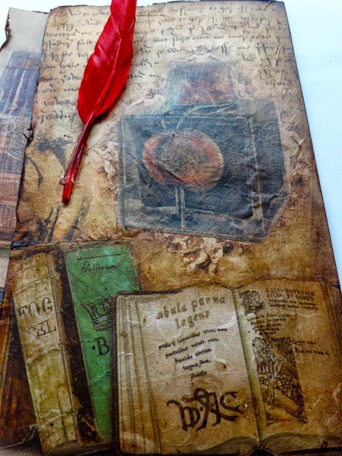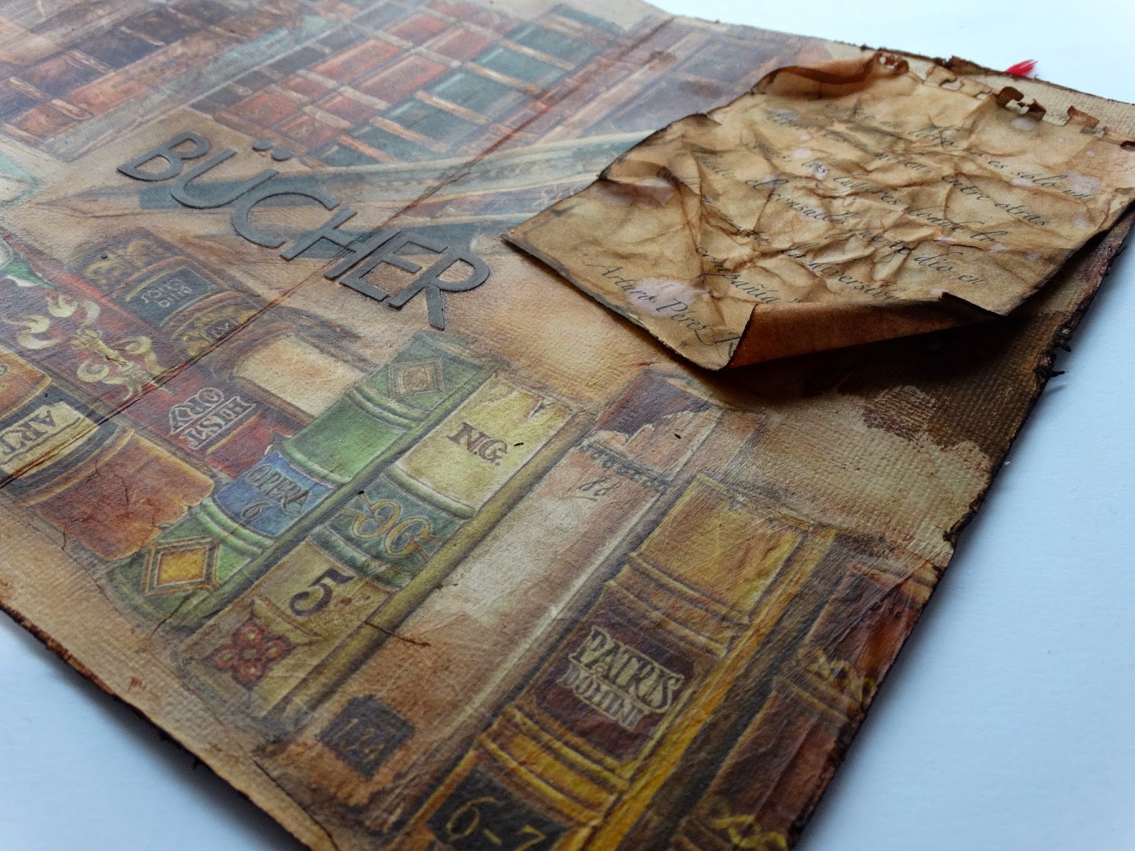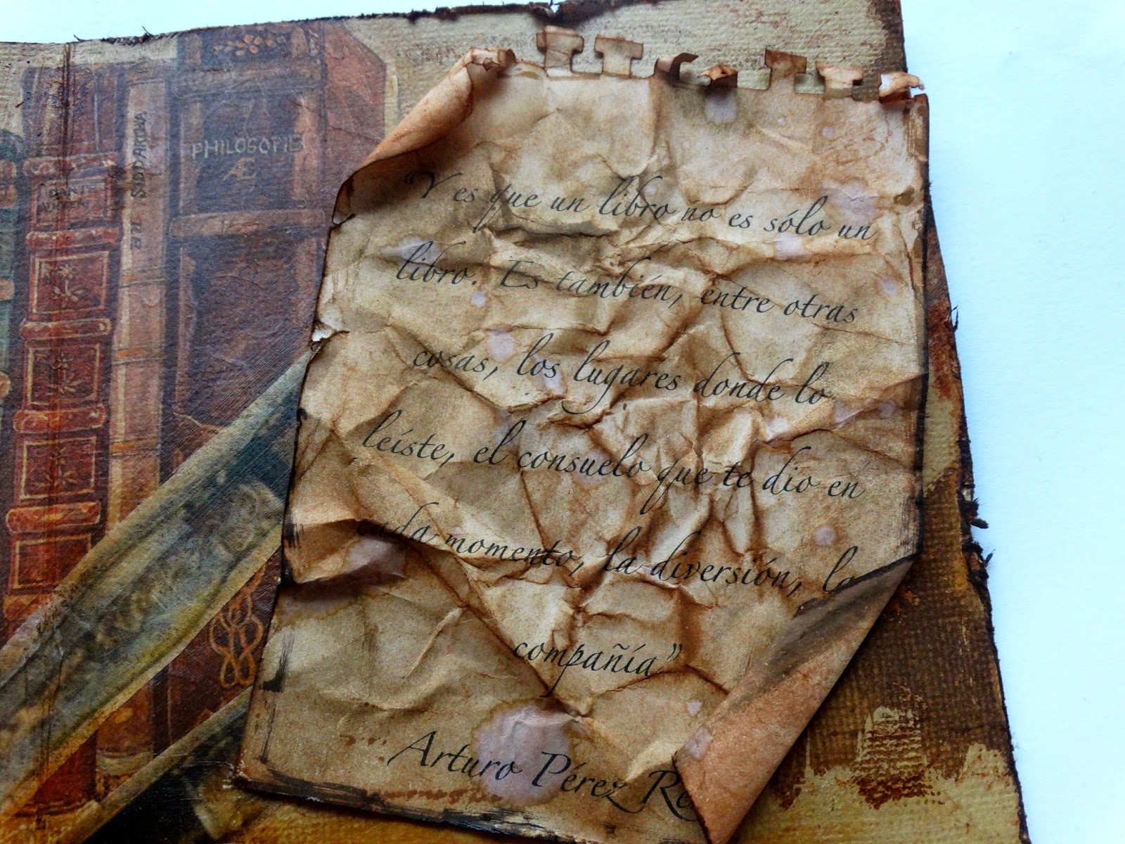 Para hacer su página usé una cartulina marrón clarito, papel de decoupage, que pegué con gel medium mate, tintas y rotuladores marrones, un abc marrón y un pedazo de papel en el que escribí una cita sobre libros y que envejecí con las tintas.