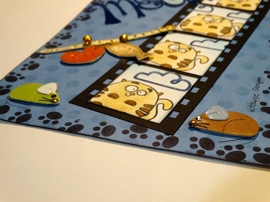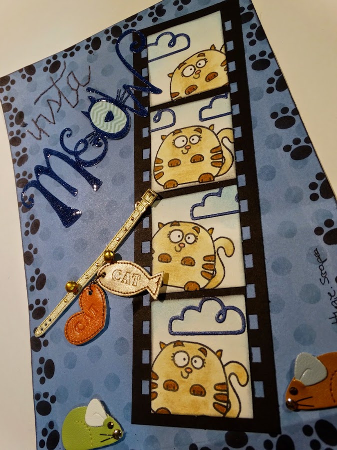 En cartulina negra le hice unos bordes con la Bind it All para que pareciera un fotograma y luego estampé y pinté 4 sellos de un gato la mar de mono, les pegué unas nubecitas cortadas con la Big Shot, para que pareciera que estaba al aire libre, corté los cuadrados y los pegué encima, para dar la apariencia de un negativo de los de antes, que ahora con era digital eso se ha perdido...