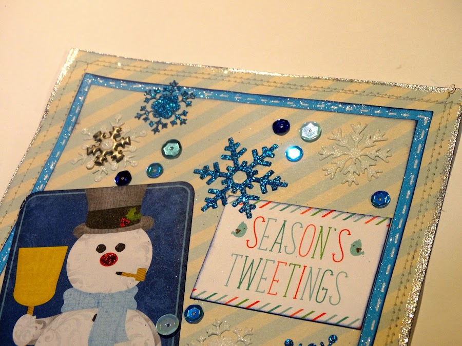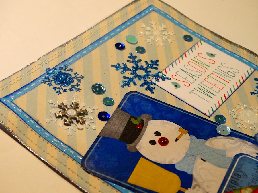 Para esta primera página usé tonos azules y para realizarla usé papel decorado, cartulina azul, unas tarjetas tipo PL, papel adhesivo con purpurina, troqueles de la Big Shot, stickles, glossy, un par de brads en forma de copo de nieve, un poco de hilo twine y unas lentejuelas. Los bordes los pasé por el pad de tinta Versamark y luego les puse polvos de emboss plateados y les di calor con la pistola. Y ya para darle un buen acabado pasé la página por la máquina de coser y le hice unas costuritas a todo alrededor y un falso cosido con un boli de gel blanco en la cartulina azul y un poco de Wink of Stella por encima para que le diera brillito.