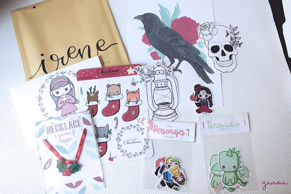 También me apunté al intercambio que organizó María, un intercambio llenito de arte. Allí me tocó como amiga invisible mi tocaya Irene, y a ella le toqué yo! Ya nos conocíamos desde hace tiempo pero fue una sorpresa verla por aquí. De ella recibí un gran paquetito lleno de monerías de las que crea y yo le envié algunas cositas de las que tengo en mi tienda.