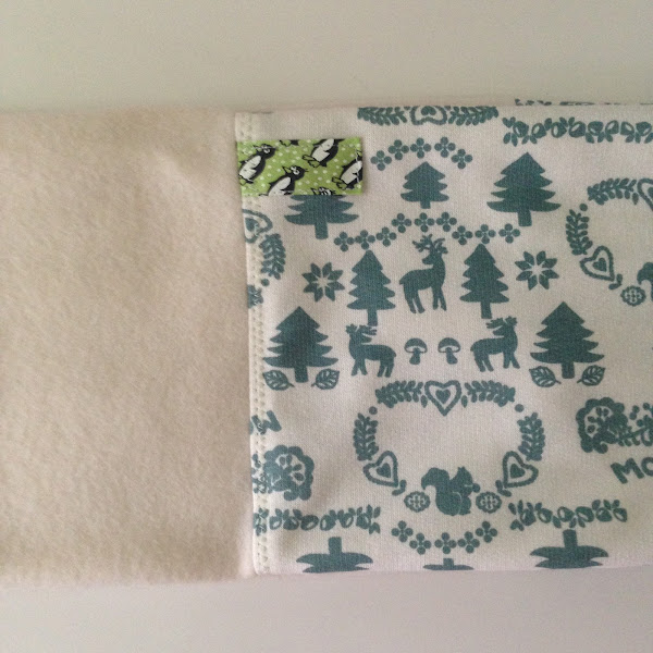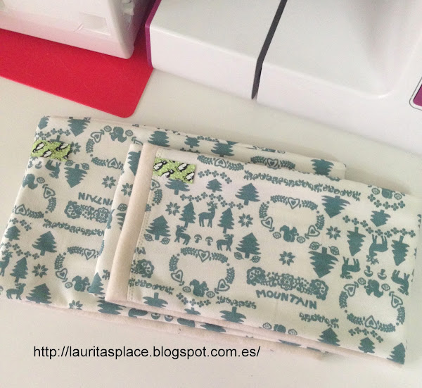 He adaptado un poco las medidas al retal de tela que tenía en casa desde hace bastante tiempo (puff menos mal que poco a poco se va vaciando el maletón de telas...). Se trata de una tela tipo sudadera con motivos casi típicos navideños, en color beis y verde. La he combinado con tela de forro polar también sacada del maletón de las telas. Al final del post os indico dónde he comprado las telas.