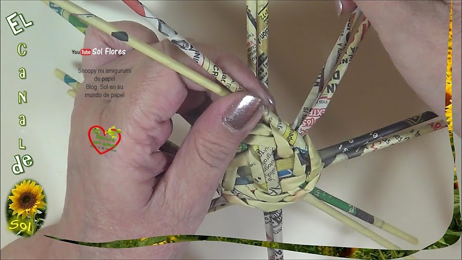 Ponemos dos varillas en cruz, añadimos dos, doblamos e iniciamos con el mismo tejido, damos dos vueltas y en la tercera empujamos los parantes al centro y los vamos juntando al tejer, para ir dando forma de cazuela.
