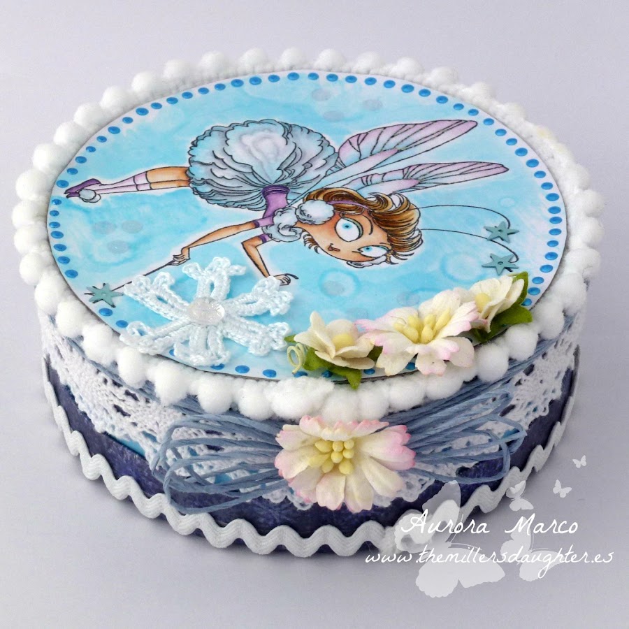 Today I want to show you my project for the current challenge at Copic Marker Spain.After all those Christmas cards, I felt like doing something different. Our sponsor this month is Kraftin Kimmie, and when I saw that my lovely Snowball Fairy fitted in it, I decided to alter a box of cheese portions.