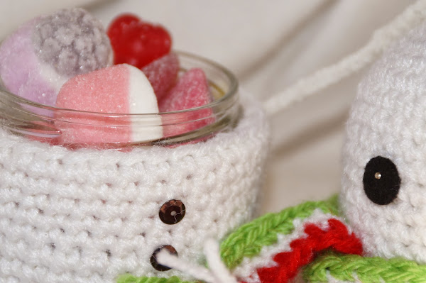 A fin de cuentas es un pequeño amigurumi, peeero, hecho a partir de un tarrito que he reutilizado de un paté. Es bastante sencillo de hacer, aunque requiere un rato, como todo lo que se hace a ganchillo, pero el resultado es bonito no?? Además, al ser un bote puede servirnos como doble regalo de navidad. Por un lado el amigurumi, y por otro, podemos guardar un detalle, o algún tipo de dulce dentro a modo de sorpresa. Mmmm un dulce... este muñeco podría tener un corazón de chocolate!! jeje
