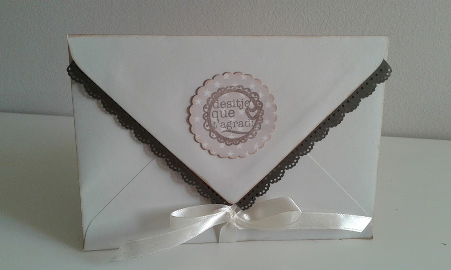 Sobre de color neutre, dos capes de papers que contrastin , fulles i arabesc troquelats amb la big, flors i perles complementen la decoració