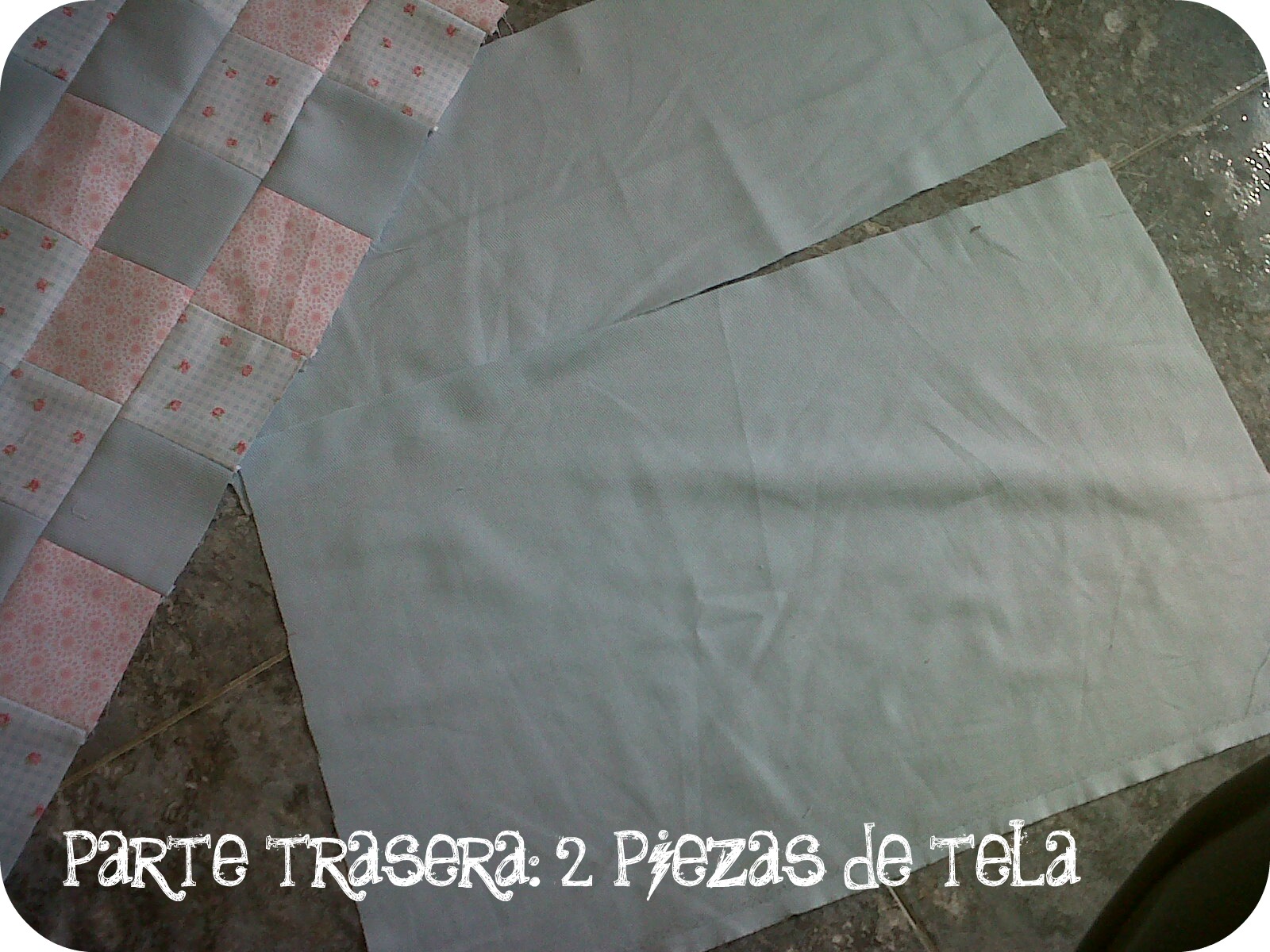 4) Una vez cosidas y planchadas todas las tiras, cortamos un trozo de tela lisa para la parte de atrás del cojín, del mismo ancho que el trozo de delante y unos 15 cm más largo. Cortaremos la parte trasera en dos trozos desiguales para unirlos posteriormente con botones, pero eso lo explicaré más adelante.