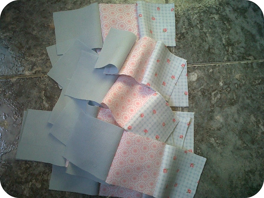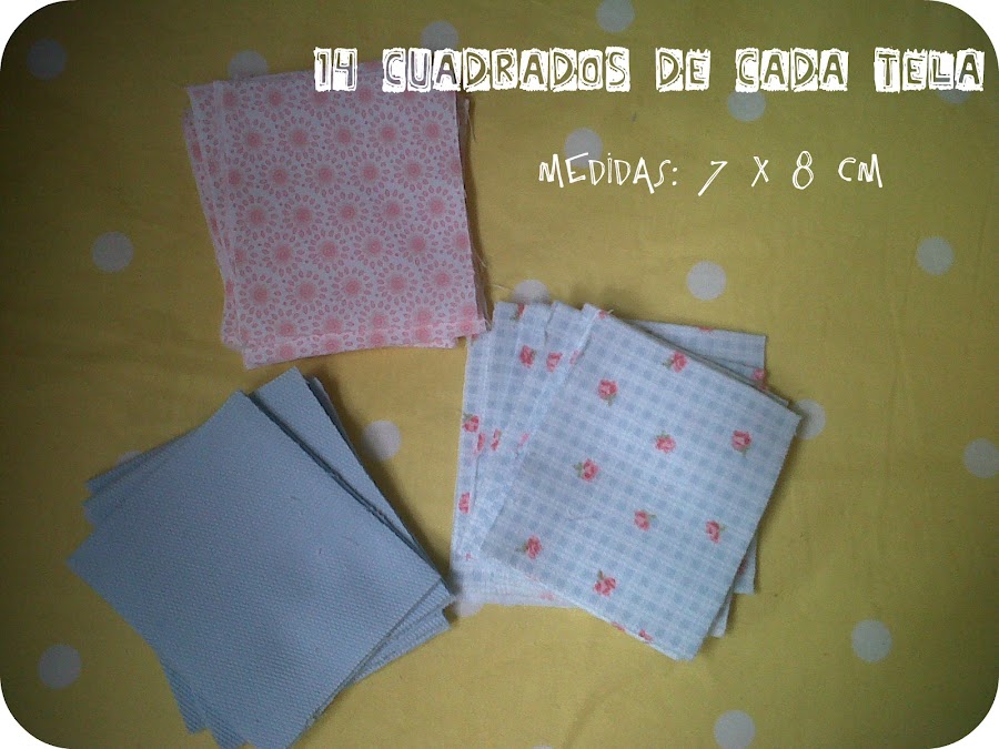 1) Empezamos recortando los cuadrados de tela. Yo he empleado dos telas estampadas y una lisa, pero se pueden utilizar al gusto. Las medidas: 7x8 cm. Cortamos 14 de cada tipo.