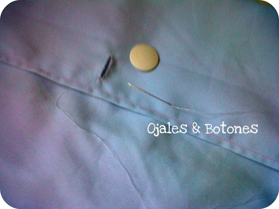 6) Planchamos bien por ambas caras. En la parte de atrás vamos a coser un par de botones para que no se salga el relleno. Haremos dos ojales en la parte de atrás y coseremos los botones.