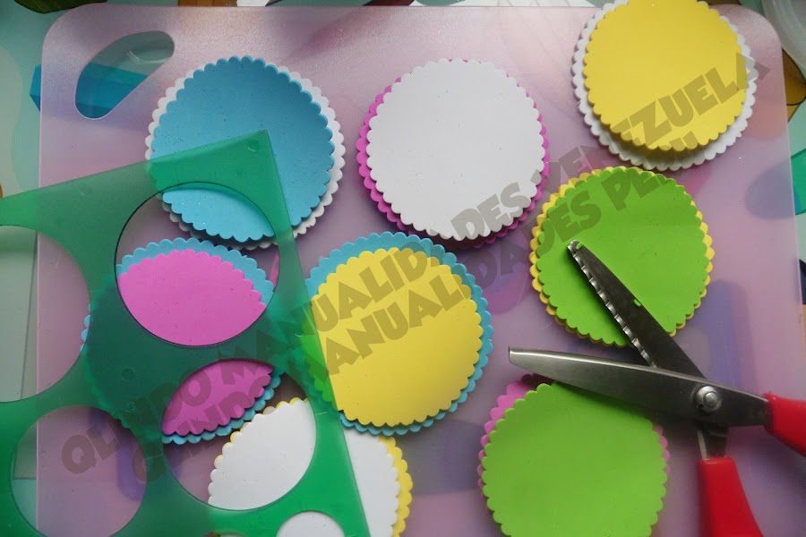 Para todos los solapines cortamos dos círculos que van a ser la base para pegar los animalitos, yo utilice una tijera de formas para cortar el borde de cada circulo.