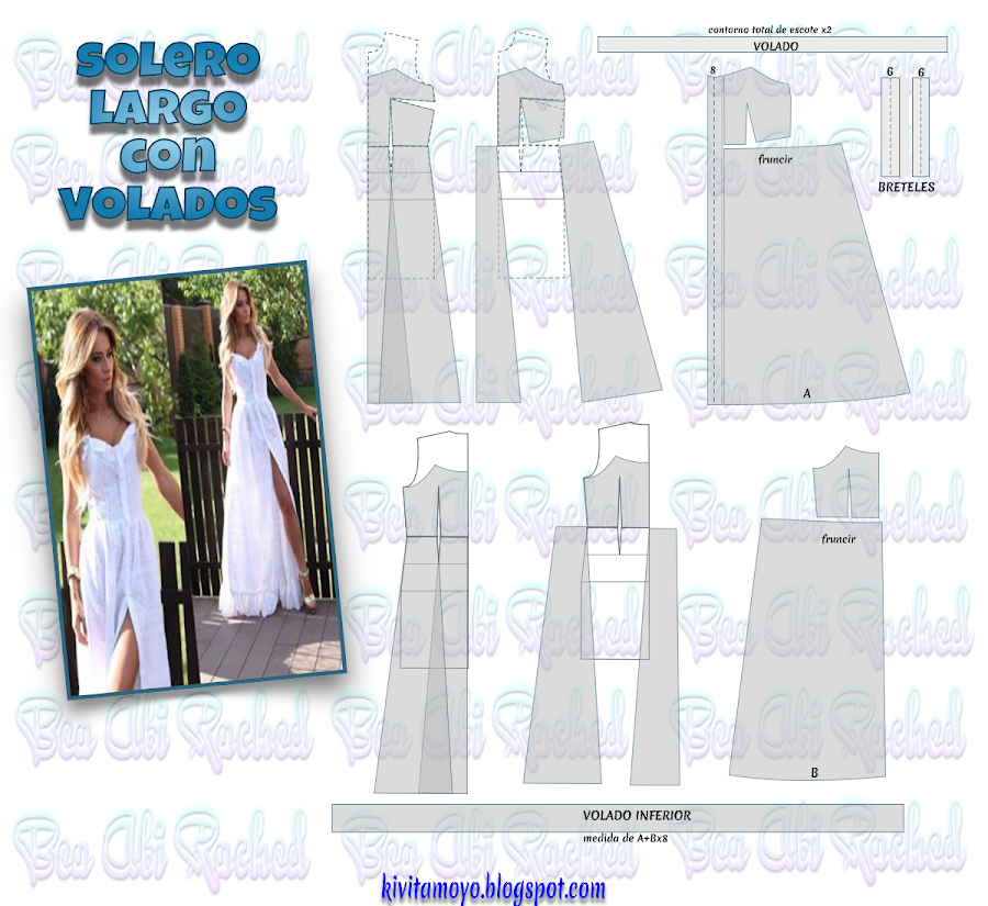 Diseñar desde el patron base. Cerrar la pinza de busto trasladandola a la pinza de entalle de la cintura. Continuar la linea de la pinza de entalle de la falda base creando el corte evasee en cada recorte. Separar las partes hasta duplicar la medida dela cintura, para dar aplintud de frunce. Incorporar un cruce como cartera unida. Tomar la medida del escote delantero y trasero y duplicar para trazar el volado superior. De la misma manera, tomar la medida total del bajo de la falda y duplicar para dibujar el volado inferior (A+Bx8). En ancho completara el largo total de la falda.