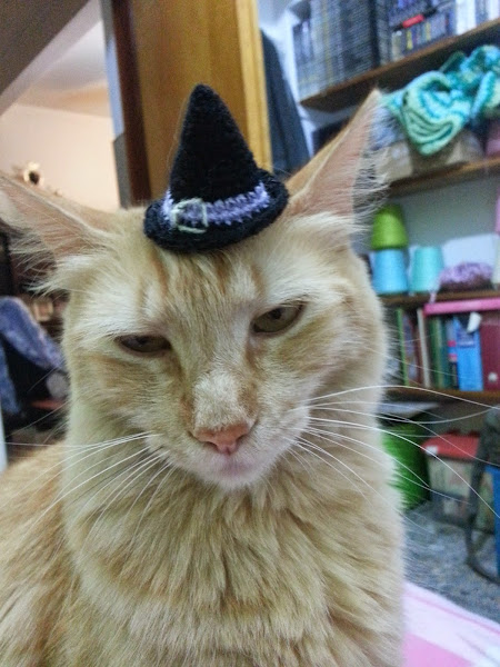 Notarán que la primera foto es una Brujita de trapo, la hice después de hacer el sombrerito, tiene aproxiamdamente 8cm o 10cm de alto. Y la segunda foto es de una de las gatas que hay en la casa de Ser que muy amablemente posó con el sombrerito en la cabeza para que se de una idea del tamaño que tiene.