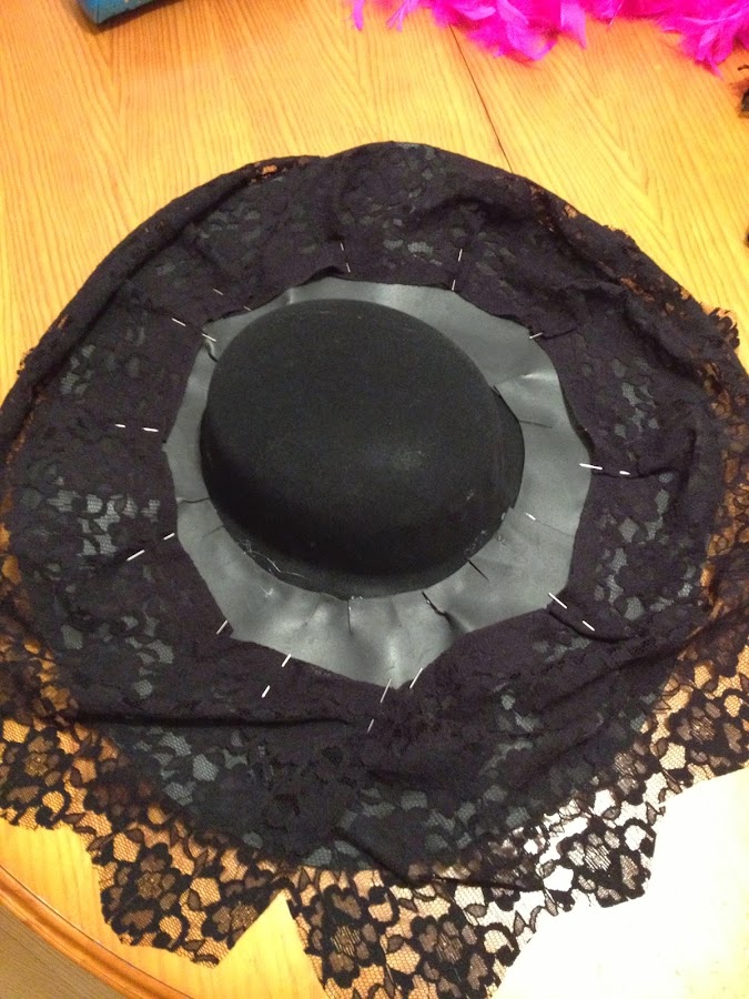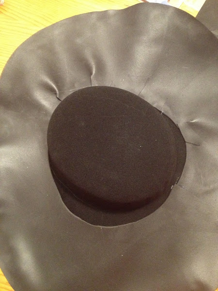 Moldea con la plancha el ala del sombrero, has de calentarla a temperatura media y conforme pasas la plancha, la goma eva es deformable, con los dedos dale forma, estirándola un poco para que quede ondulada. Ponla sobre el bombín, puedes necesitar dar unos cortes en la parte interior del ala del sombrero para ajustarlo al diámetro del bombín, aprovecha para que el ala quede más ondulada.