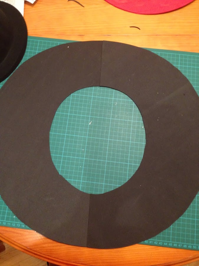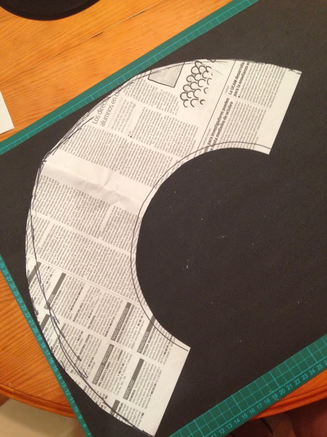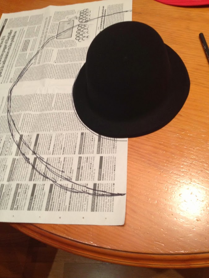 Coloca el bombín sobre una hoja de periódico y dibuja el contorno del ala que quieres ponerle, ten en cuenta que el circulo interno debe ser mas pequeño que el ala del bombín, puesto que has de pegar la goma eva sobre él.