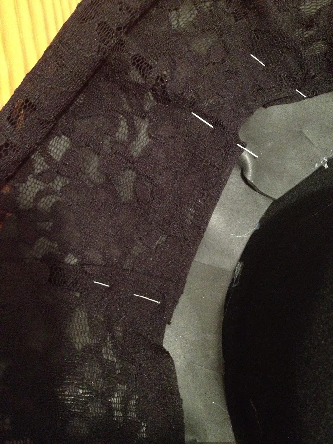 Pon el encaje sobre el ala y ve pegando con puntos de pegamento caliente.