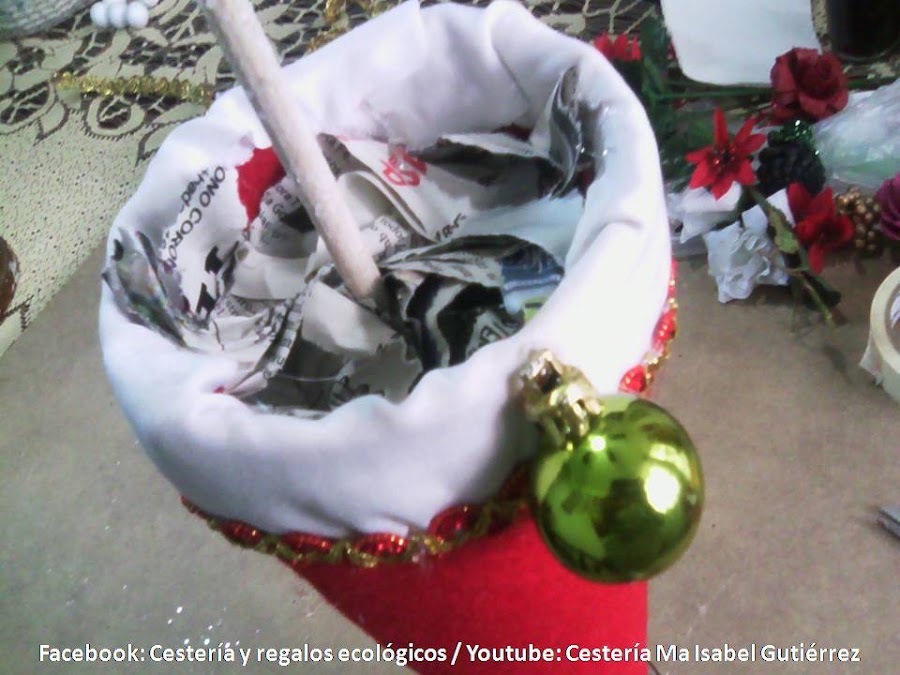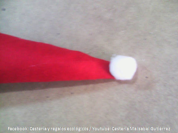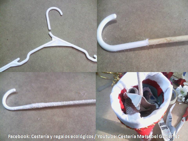 Aparte, cortamos la parte superior de un gancho de ropa, pegamos con silicón a un palo de madera del tipo de brochetas y afianzamos pegando alrededor de la unión cinta de papel. Pintamos el palo en color blanco y el gancho en color rojo, si es nuestro gusto, ponemos un poco de diamantina del mismo color. Insertamos en el cono y ponemos bastante silicón. Para que el palo se mantenga en el centro, rellenamos alrededor con pedazos de papel, y las dos últimas capas de papel las pegamos con silicón para formar como una especie de tapón...
