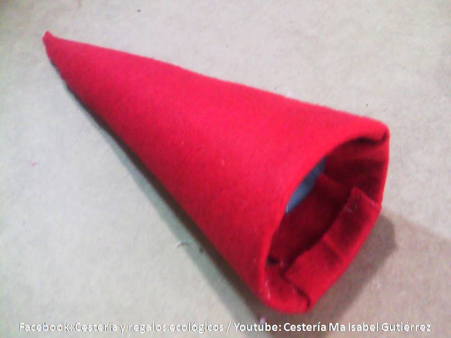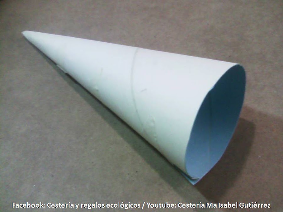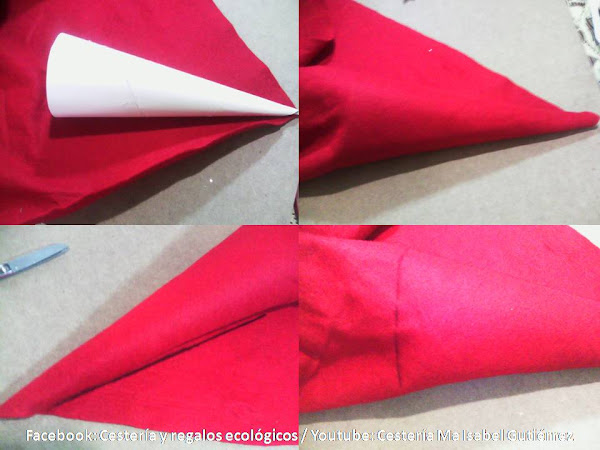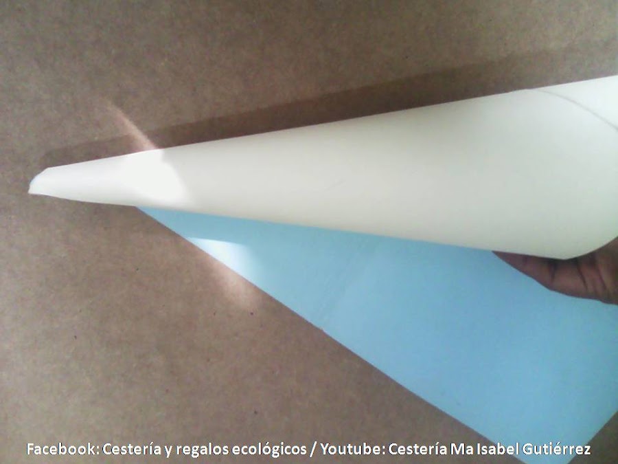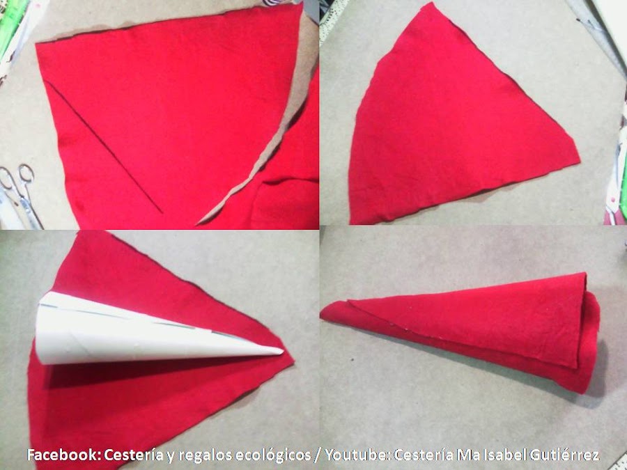 Acomodamos el cono en una esquina de la tela, enrollamos la tela sobre el cono, recortamos el exedente...
