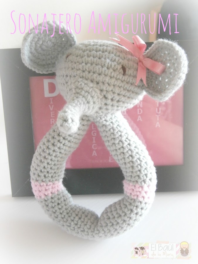 Como veis es un circulo para que pueda agarrarlo bien, y la cabecita de un elefante. Ahora que ya tiene 7 meses lo agarra sin problema, pero la forma circular, nos vino de perlas cuando era más pequeña para ponérselo en la muñeca a modo de pulsera. No veáis el ajetreo que se traía porque al mover la mano aquello sonaba!!