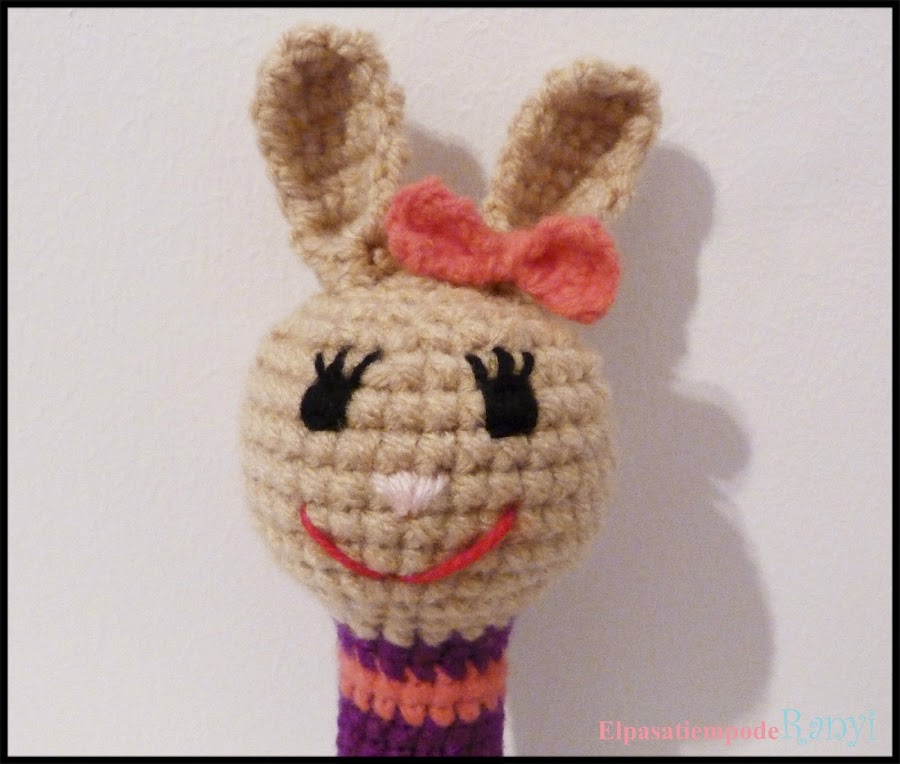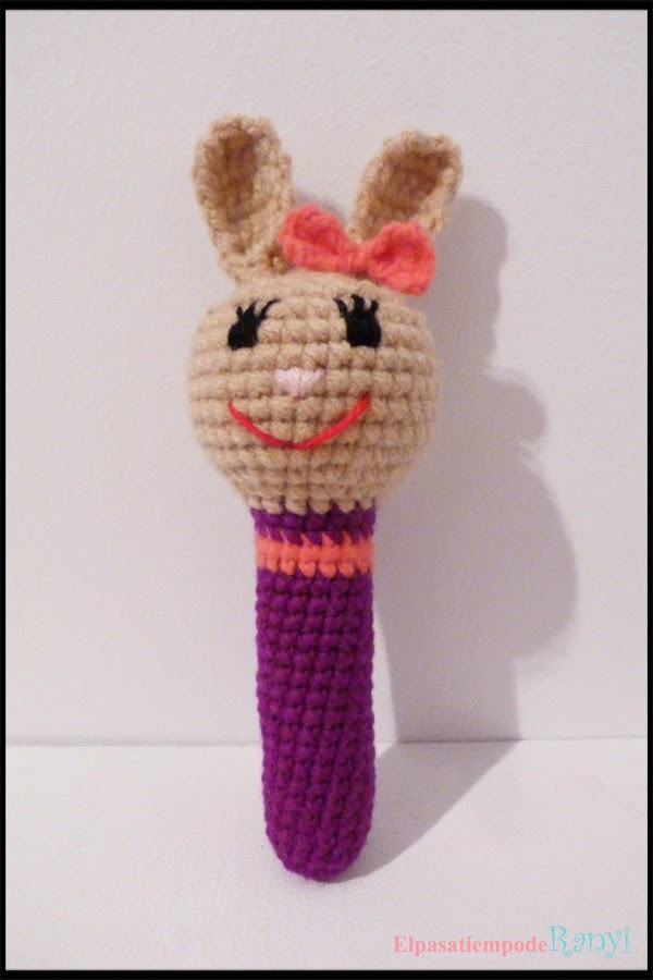 Hoy os voy a enseñar un nuevo sonajero que realicé hace algunos días. En esta ocasión es para una nena, Alba, un preciosa rubita con gorditos mofletes hija de una amiga de mi cuñada. Realicé una conejita con un lacito rosa la mar de mona que espero que les guste mucho tanto a la mamá como a la pequeña. Como ya sabéis la técnica amigurumi es la que se utiliza para hacer estos muñequitos que van rellenos de guata.