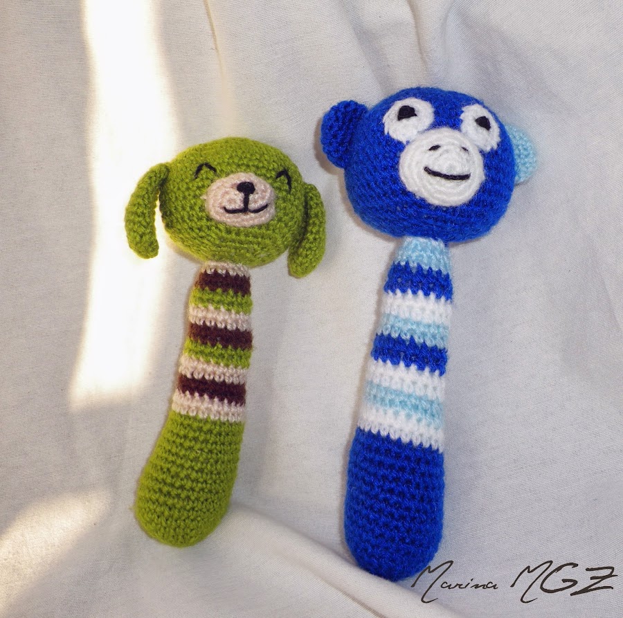 En estos días he preparado una cestita con un sonajero para una amiga que acaba de tener un bebé y otro que me han pedido, así que he estado tejiendo estos para niño. Debajo os pongo una foto de otro que hice para mi sobri Lucía. El patrón de estos es el mismo que el de mis sonajeros anteriores, que tomé de http://amigurumies.blogspot.com.es/ y que ahora he adaptado cambiando la posición de las orejas y la forma de tejer los detalles.
