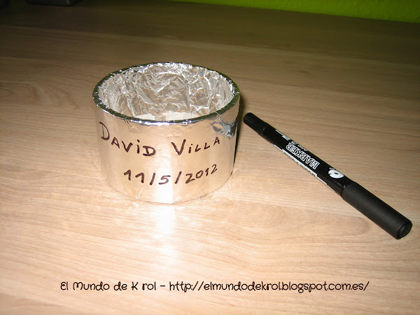 Ahora le damos la vuelta y escribimos el rótulo con rotulador permanente. En mi caso he puesto "David Villa" y la fecha en la que se la regalaron.