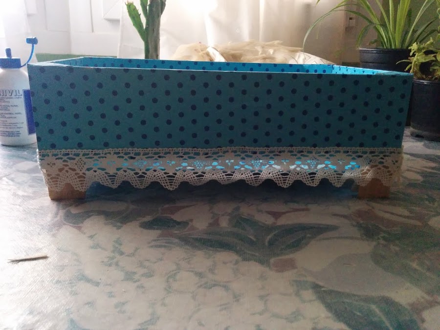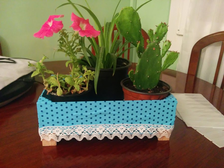 Para finalizar le coloqué la puntilla que había seleccionado en un principio y quedó así. Como veis la tapa se había bajado un poco por lo que esta mañana he tenido que volver a reinventar una forma para que quedará más o menos bien, la he sujetado con unas grapas para que no se moviera mucho pero no estoy muy segura de que no se vuelva a caer otra vez con el peso de las macetas. Esta foto es de esta mañana, cuando iba a colocar las macetas, por eso el color y la luz son distintas. Pero como lo que importa es el resultado final, os vuelvo a dejar la foto del comienzo. A mí particularmente, me gusta como ha quedado y más si tenemos en cuenta que al comienzo no tenía ni idea de lo que iba a hacer. Bueno eso debe de ser cosa del calor que me tiene el cerebro derretido.