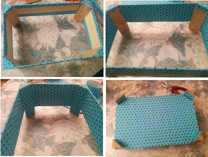 En esta primera foto podéis ver como quedó una vez forrados los laterales exteriores. Para volver el papel hice unos cortes a la altura de las patas y lo doble hacia el interior como se ve en la foto.Continúe forrando la caja colocando piezas en los laterales interiores para que quedará más limpio y por último hice unas piezas con la forma de las patas y las coloqué para completar el efecto, los trocitos de las patas exteriores no los forre porque me gustaba como quedaban en el color de la madera. Para finalizar la caja coloqué la tapa por la parte de abajo sujetándola con silicona caliente pero os recomiendo que antes de forrar la caja sujetéis bien la tapa a la caja con cinta adhesiva para reforzarla bien.