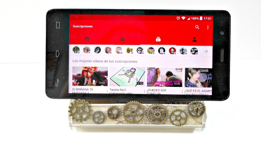 Para esta última idea, lo único que tienes que tener en cuenta es dejar un tope, que pueden ser los mismos adornos. Como dije antes, decoré con engranajes, pues esos mismos engranajes los dejé un poco sobresaliendo de la caja y hacen de soporte para el móvil en horizontal y puedo ver vídeos mientras trabajo.