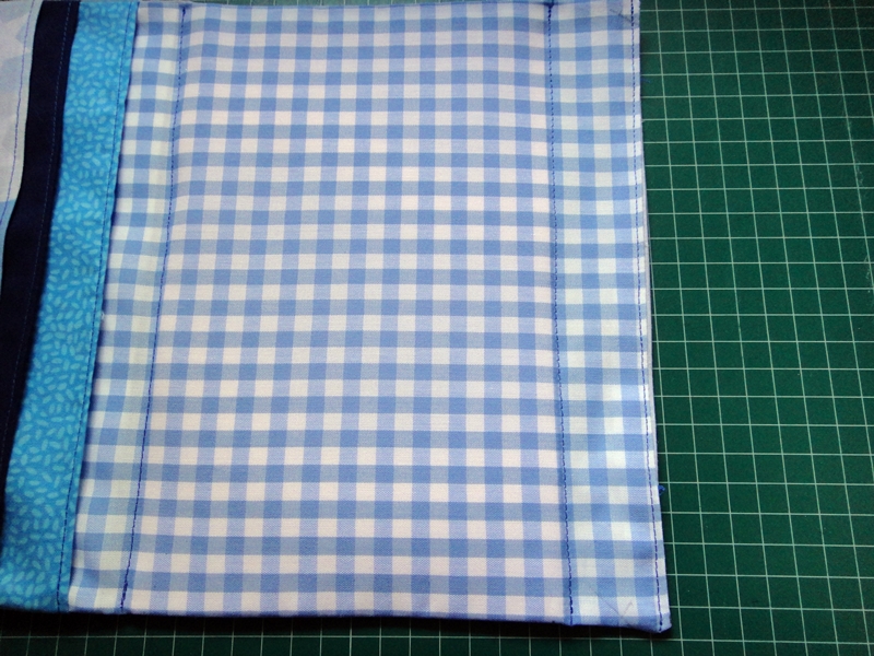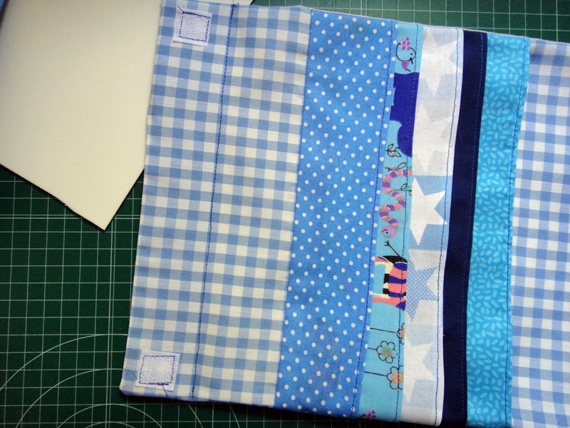 Hacemos lo mismo con las otras tres piezas: la tira de 4 cm que nos queda, y las dos de 14.5 cm, haciendo pespunte entre cada una de ellas, antes de meter la siguiente. Para finalizar, hacemos un pespunte a unos 4 cm del borde para sujetar la última pieza de goma eva, y otro cerca del borde cogiendo dobladillo y cerrando la abertura que dejamos.
