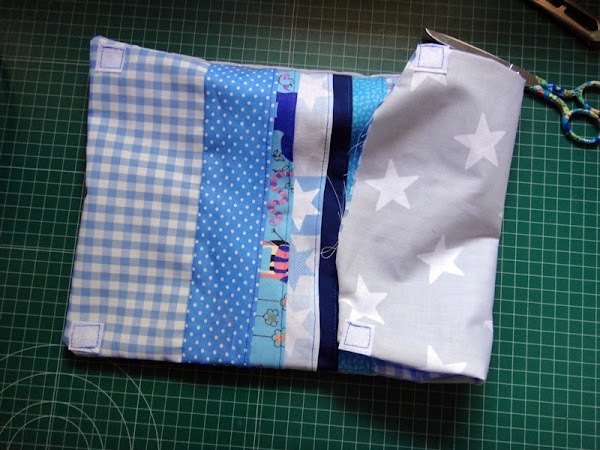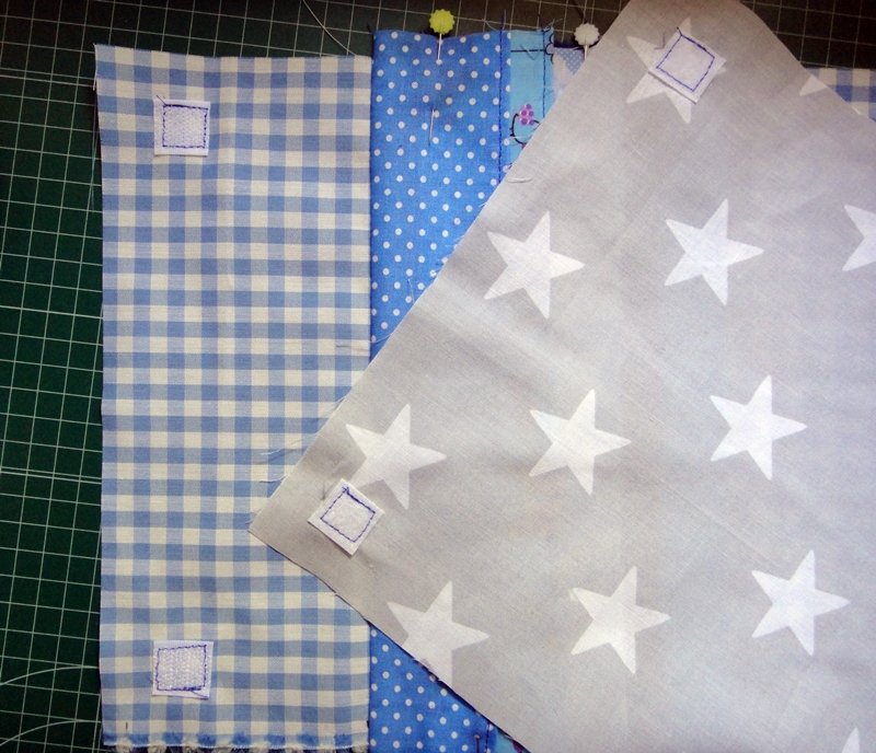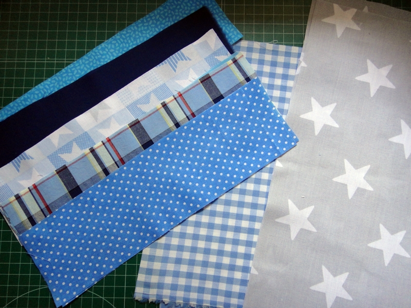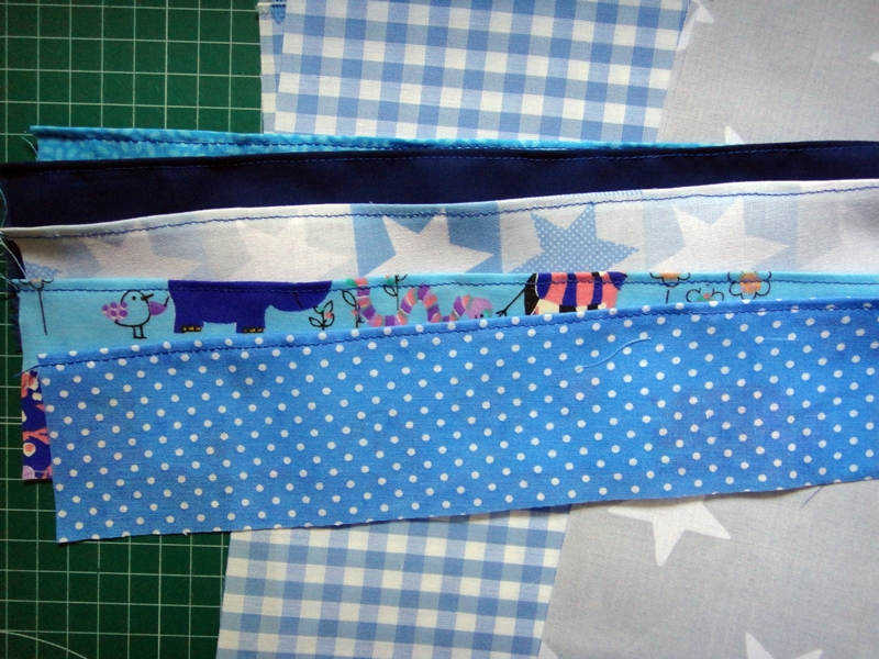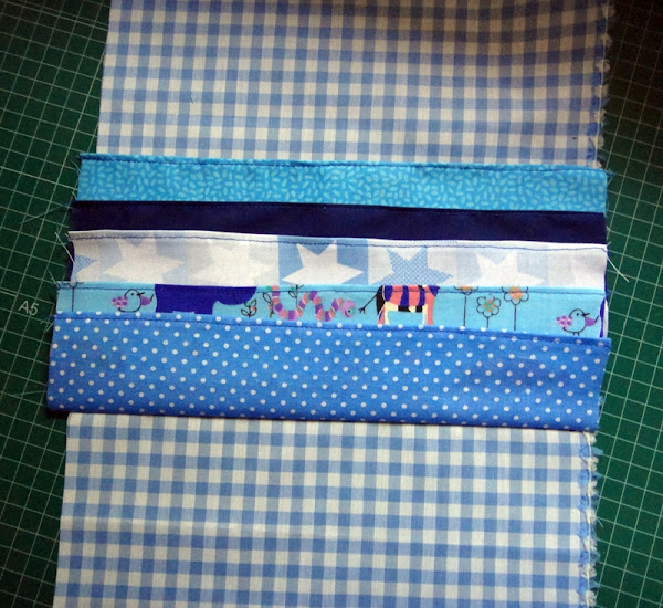 -5 tiras de tela de 7.5x27 cm. Pueden ser todas de la misma tela o utilizar retales que tengáis por casa. Como veis, los míos son de retales.