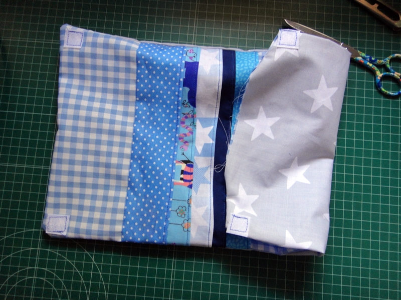 Colocamos las dos telas derecho con derecho, asegurándonos de que los velcros quedan en lados opuestos y cosemos tres de los lados: los lados largos y el lado más cercano a los bolsillos. Pulimos esquinas y damos la vuelta por el lado que quedó abierto.