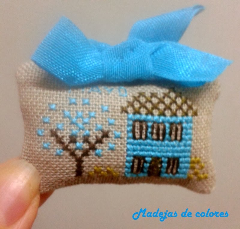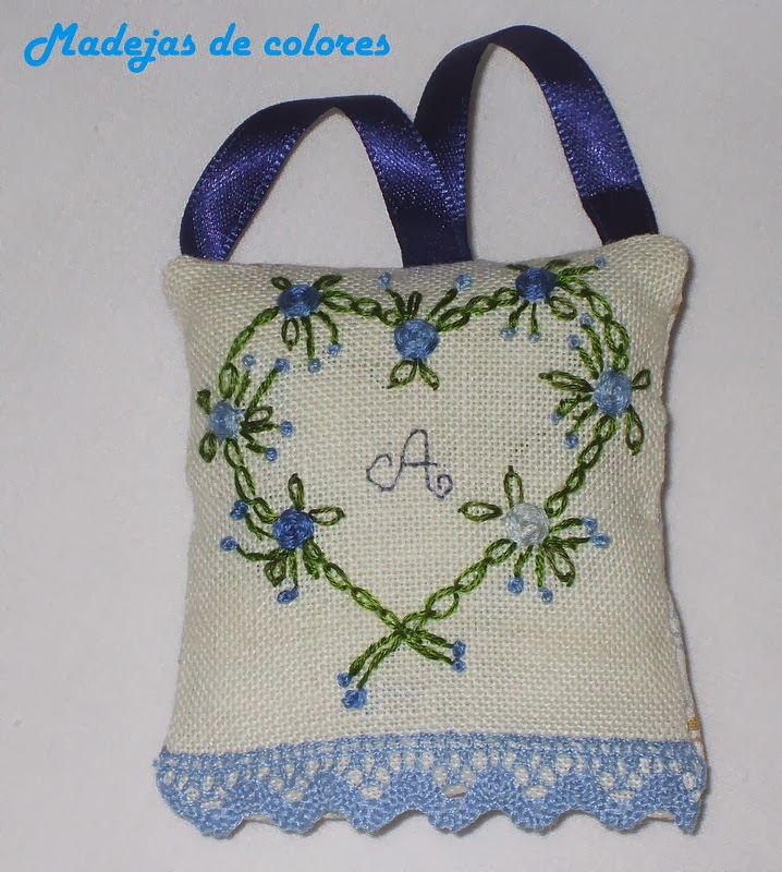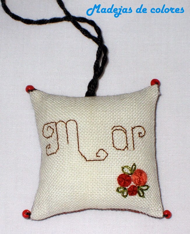 No creen que es un regalazo en toda regla, pero la joya de la corona, es este cojincito con su argolla para poner las madejas mientras trabajo, y en el cual se aprecia, todo el cariño puesto, pensando en mis gustos, al hacerlo en mi color favorito, ya habréis adivinado que es el turquesa y bordar el mes de mayo, en el que cumplo años.